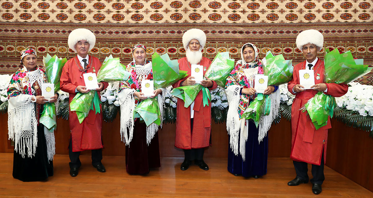 In a solemn atmosphere, President Serdar Berdimuhamedov presents the relevant badges and certificates to representatives of the older generation, who were awarded the title of "Türkmenistanyn "Hormatly il ýaşulusy", and awards to respected mothers who were awarded the "Zenan kalby" order.