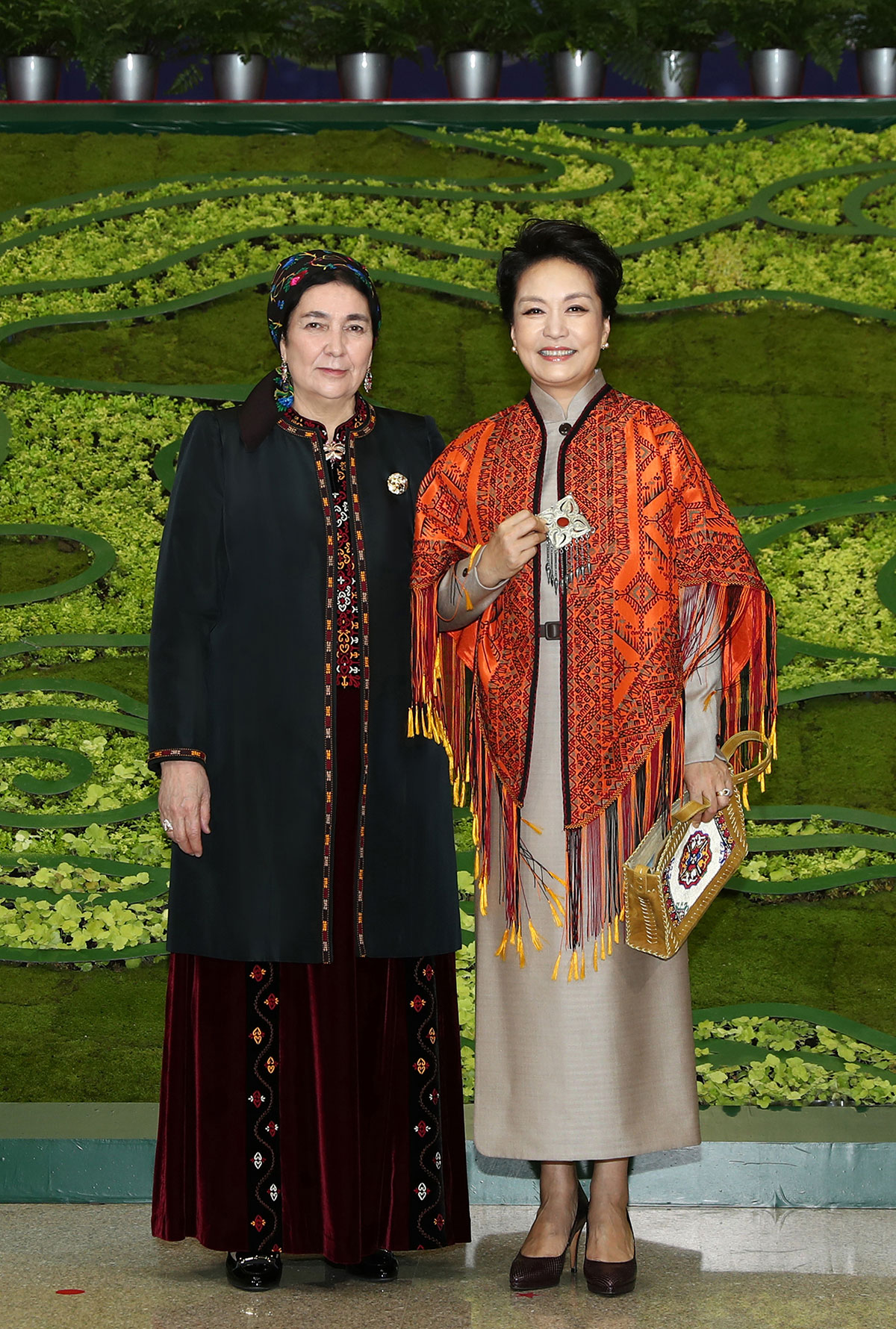 In the foyer of the building, the wife of Hero-Arkadag was warmly greeted by the wife of the Chairman of the People's Republic of China, Peng Liyuan, where they took a photograph for memory.