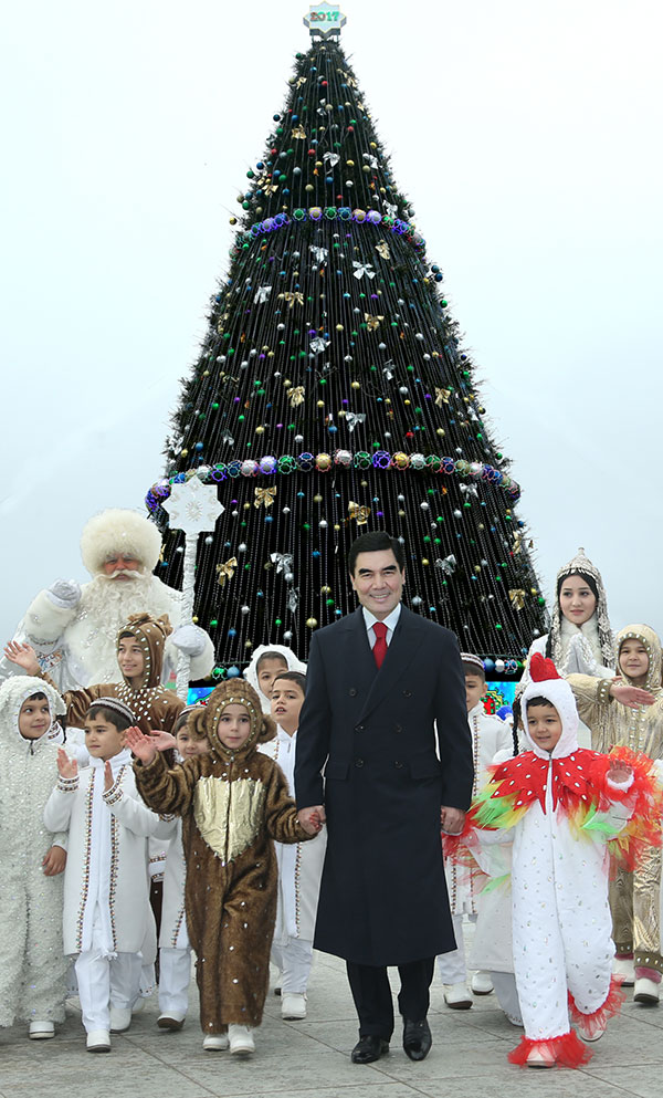 Today, President of Turkmenistan Gurbanguly Berdymuhamedov attended the New Year show at the main New Year tree, sharing this joyous and fun event with young participants of the celebrations, organized in front of the cultural entertainment center “Alem”. These days, a lot of children, including guests from all over country, had crowded there. The overachieving students, winners of subject Olympiads, sports and art competitions, as well as inmates of children’s home had been invited for celebrations. Every year the Head of State visits New Year show at the main tree, finding the time in his tight schedule. And every time the President uses this opportunity to talk with young generation about the country’s future and its tomorrow. On the square in front of the “Alem” center, President Gurbanguly Berdymuhamedov had been welcomed by child singing and dancing art groups. The young citizens of the country sincerely congratulated and expressed best wishes to the Head of State, who warmly welcomed all participants of the New Year show. The festivities started with enthusiastic and emotional performance of young artists, kindling audience’s cheerfulness and optimism. Among them - singers, musicians and dancers. The students of the Special Music boarding school at the Turkmen National Conservatoire, Ashgabat Palace of children and youth, dance groups “Ruhybelent chagalar”, “Joshgun”, “Galkynysh”, violin group “Mukam” and choir “Gunesh” and others appeared on the stage. President Gurbanguly Berdymuhamedov had shared with the kids the fun and joy of the favorite holiday. Then, to children’s delight on behalf of the President of Turkmenistan, they were presented with New Year gifts. Wishing happy New Year, great winter vacation, advances in studies, fulfilment of dreams, President Gurbanguly Berdymuhamedov had expressed confidence that they will become worthy successors of the best national traditions, wise precepts of ancestors and the real masters of the Motherland and, will contribute to the prosperity of Turkmenistan. Once again thanking all participants for show full of inspiration, the President had left the cultural and entertainment center Alem for Chamber of Commerce and Industry of Turkmenistan, where New Year celebrations had been continued. The country’s executives, gathering there with their children and grandchildren, welcomed the Head of State. President congratulated the young citizens of Turkmenistan and all the participants of New Year show and wished the young generation to be good students and to become worthy citizens of the country. Our government will continue to take utmost care of harmonious and full-fledged development of children, provided with the necessary conditions for obtaining deep knowledge and high-quality education, said President Gurbanguly Berdymuhamedov. It was also stressed that our country has created all the conditions for the unleashing creativity of oncoming generation. Various contests are organized for gifted children, such as “Garaşsyzlygyň merjen däneleri”. The hall, smartly decorated in new year style, had become venue for grand performance with exultant music, songs and stirring dances. Ayaz Baba or Grandfather Frost had invited the children to surround the New Year tree and had announced signing, reciting poetry and dancing contests. Young dancers and singers had won the audience with rousing artistry and charm. The kiddies, playing the comic scenes, had evoked the smiles and warm emotions by good humor, interwoven in everyday life and enriching it with wisdom of simplicity and naturalness. The performances of circus group of the Turkmen State Institute of Culture, beginning jugglers, working under the guidance of Turkmen State Circus masters, had fascinated the audience. The Turkmen State Puppet Theater, staring the children in its performance, had presented the music show “New Year melodies”. Then, the children of representatives of diplomatic foreign missions, in different languages had congratulated the President of Turkmenistan and the public on coming New Year. The “Celebration Waltz” of Strauss, virtuosic performed by young violinists, had immersed the audience into atmosphere of beautiful melody. The pairs of dancers – boys in black suits of boys and girls in white ball dresses, gracefully slid to the accompaniment, had made the public to feel the eternity of the music. The concert presented the colorful original Turkmen tunes, full with ethnographic peculiarities, inimitable folk melodies, unique vocal techniques, tinted by choreographic patterns, giving the sense and energy of the ancient Turkmen ceremonial dances. The winners in various categories were awarded the prizes. And the main winner was presented with giant cake, which he shared with everyone. The celebrations had gained scale and entered the final straightway to spread all over the country in New Year's eve, involving everyone in this bright and joyful event, evoking happy smiles and good mood.