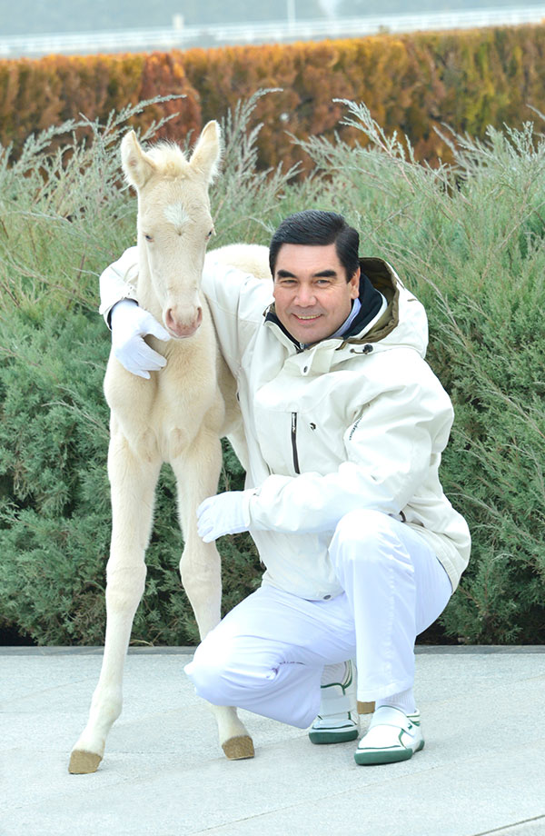 President of Turkmenistan Gurbanguly Berdimuhamedov, in existing good tradition, has visited an equestrian complex in the first days of this year. At the time of walking Akhal-Teke horses on the site of the complex, the head of state has received glad tidings – a foal was born. Of course, the birth of foals is always a great joy for horse-breeders, and it happens regularly. But the current event is symbolic in that it occurred in the first days of the New Year, which in Turkmenistan has been proclaimed to be the Year of health and inspiration. Therefore, it was decided to name the foal Ruhubelent (Inspiration). Above all this, the foal is of white color. And white is the color of purity and perfection. From ancient times it is endowed by Turkmens with the properties of divinity and holiness. People have a lot of phrases where white color determines the meaning of an entire phrase: ak ýol - white (light) road, ak öý - white house, etc. Yet another direct association with Akhal-Teke horse is a faithful companion of the brave Georogly – white stallion Gyrat. In this Turkmen heroic epic, the story of birth of the “winged horse” is associated with the predictions of divine elders. Mounted on “winged” Gyrat, defending his homeland, Georogly was invulnerable to enemy arrows and swords. Immortal image of national hero, flying on his white steed, has reached us though many centuries. Many and many generations have been brought up on this epic and today it has not lost its significance in terms of patriotic education of the Turkmen youth. Gyrat represents the world's best Akhal-Teke horse, which is the source of pride and heritage of the Turkmen people. ... The white foal named Ruhubelent will become big, strong, fast and beautiful, with chiseled article, as befits the representative of the Akhal-Teke breed, in two or three years, as for now, the baby keeps closely pressed against his mother, who does not leave it by a single step. Only to the gentle and caring hands of seyis does she trust her magnificent treasure. The pedigree of Ruhubelent goes back to the famous line of Perrin. The ancestors of this newborn stallion were noble horses. One of them - Akhal-Teke horse Polatly, is depicted in a monument on the highway leading to the International Equestrian Sports Complex. At the time, unparalleled in beauty and playfulness, dun Polatly has won numerous titles and prizes, performing in different countries and competing with outstanding horses, setting a record that remained inaccessible to horses of the planet for about three decades.