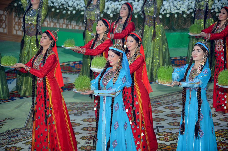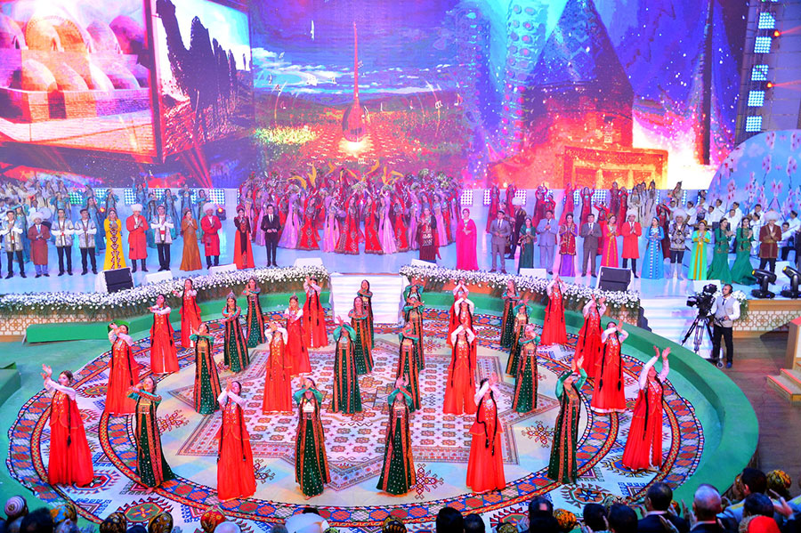 The city of Mary hosted main Novruz festivities in the square in front of the Cultural Events Center, “Türkmeniň Ak Öýi”. Opened in 2015 when the city was a culture capital of the Turkic World, the center became the first of its kind. In accordance with the Decree issued by President Gurbanguly Berdymuhamedov, a similar 3,000-seat concert hall is now under construction in “Nowruz Ýaylasy”, a specially-designated area not far from Ashgabat. Among those attending the festivities in honor of Novruz were the Mejlis Chairperson, government members, leaders of ministries and agencies, regional governors, representatives of public organizations, foreign and local media, heads of the foreign diplomatic missions and international organizations accredited to Turkmenistan, creative workers of our country, numerous residents and delegations from all velayats, foreign guests. At the airport, the guests received a warm welcome and were offered to taste mouth-watering toi-pishme, traditional national sweets and fruits. Nearby the “Türkmeniň Ak Öýi” Center, is a big improvised traditional village with yurts, livestock, steaming cauldrons, and an oriental bazaar with its many-colored stalls, energetic sellers and performers entertaining the event attendees. The event participants were greeted with fast-paced music and dances performed by artistic groups, soloists and folk groups. Children enthusiastically recited poems and sang cheerful songs for the guests. They also demonstrated children’s folk entertaining games; boys were playing with little bones and girls – with handmade dolls. Four-footed “characters”– charming alabai puppies, lambs and other animals fit perfectly into the scene. Each region of the country gave its musical and ethnographic performances, presented exhibitions and theatrical sketches with various traditional Novruz rituals. Some people were making ploughs; others were busy making musical instruments, sellers were briskly selling their sheepskin hats and embroidered caps. On offer were bright silks, glazed jugs and dishes. Nearby were unmatched Turkmen carpets, beautiful items of jewelry and national embroidery. Old melodies performed by bakhshi (folk singers), who were surrounded by enthusiastic listeners, created an wonderful background. The ceremony participants had a chance to see how national dishes were made to old recipes, including the main Novruz dish – “semeni” and witness the traditional wedding and family rituals. All these theatrical performances were accompanied by songs, riddles and sayings. Big models of famous historical monuments of Turkmenistan – Ancient Merv, Kounyaurgench, Dehistan, Anau, and others, added to the atmosphere of the fascinating excursion into the past. The exhibitions featured achievements of modern Turkmenistan in various sectors – agricultural products, textiles and others. An art exhibition was devoted to the beauty of spring, Turkmen nature and its bounty, the people living in harmony with it. The collection of paintings from the Museum of Fine Arts of Turkmenistan was on display together with works by students of the State Academy of Arts and pupils of the special art school. During the celebrations, everyone could taste delicious food cooked in cauldrons on the spot. The guests sampled the dishes of national cuisine with delight and interest. Drinks, such as chal (camel’s milk), hot green tea made over fire were also on offer. Young people gathered by high swings, decorated with floral garlands. A ride on the swing is regarded as ritual cleansing, which enables to welcome in the New Year with fresh energy, and open heart. Performed by the country’s art masters, a gala concert was held on the stage of the “Türkmeniň Ak Öýi” Center. The audience was presented with a great number of pop songs, which have become true classics, including from favorite films. “Galkynysh”, the national equestrian group, gave an impressive performance – “Gyratym girse meýdana”. Brave riders astride magnificent horses demonstrated to music their matchless proficiency, having left the audience overwhelming emotions and earned thunderous applause. Original literary-musical, folk-ethnographic compositions reflected the characteristic features of national culture. Everlasting, ancient dance “kushtdepti” once again won the hearts of the audience with its movements and rhythm. A theatrical performance, “Mirasyma sarpam bar!” with the participation of all performers was the grand finale of the concert, which reflected the optimistic philosophy of Novruz. The festive events continued at “Toi Mekany” of the “Bagt Köşgi” Banquet Hall, where a sadaqah ceremony was held. When night fell, ritual fires were lit in the square in front of the “Türkmeniň Ak Öýi” Center. To the accompaniment of songs and music, members of folk groups as well as anyone who wished, jumped over the flames as our ancestors did in those far-off days with a belief that it would bring them luck and wellbeing. Festive concerts and mass cultural events were held in all administrative centers of our country’s regions and Ashgabat city.