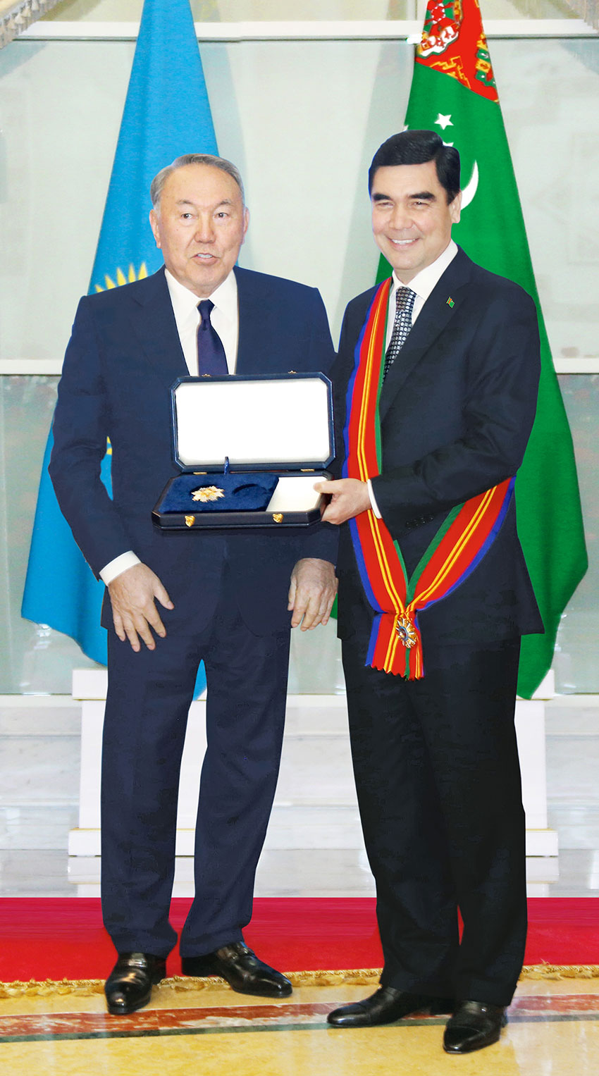 The President of the Republic of Kazakhstan gave an official dinner in honour of distinguished Turkmen guest at the Akorda Palace. The leaders of the two states exchanged speeches at the official reception. Underlining the outstanding contribution of President Gurbanguly Berdimuhamedov to the development of friendly, good-neighbourly relations between the two states, enhancement of the fraternal ties between the two peoples as well as maintenance of peace and harmony in the world and promotion of fruitful international cooperation, the President of Kazakhstan announced the decision to present the high state award of the Republic of Kazakhstan – the Order of Dostyk 1-st class to the President of Turkmenistan. To the applause of all those present, President Nursultan Nazarbayev presented the high honorary award to the President of Turkmenistan. Expressing sincere gratitude to the President of Kazakhstan for the honour, President Gurbanguly Berdymuhamedov noted that he considers this fact as the acknowledgement of the strong relations of friendship and fraternity between the two countries and high assessment of Turkmenistan’s peaceful neutral foreign policy as well as the award to the whole Turkmen nation.