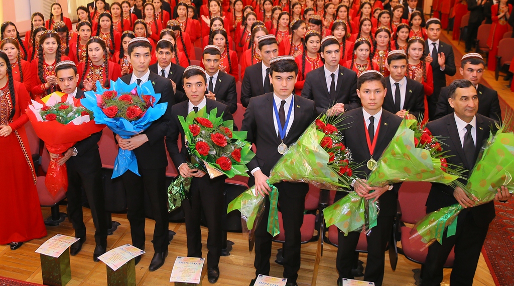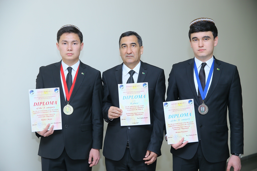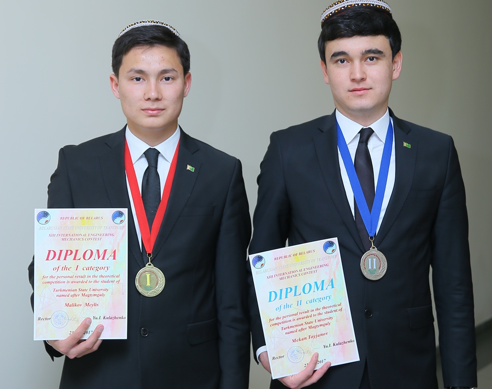 Another testimony to the effectiveness of President Gurbanguly Berdimuhamedov's policy in the field of education, the success of reforms carried out in this sphere, were the awards of students of the Turkmen State University named after Makhtumkuli at the 13th International Olympiad in Theoretical Mechanics in the Republic of Belarus. Competitions held at the Belarusian State University of Transport gathered 145 students from 35 universities of the Russian Federation, Ukraine, People's Republic of China and other countries. Students of physics department of TSU, specializing in radiophysics and electronics Meilis Myalikov and Mekan Tojjanov were awarded gold and silver medals in the individual championship respectively. Good results were also shown by our students under the supervision of the head of Applied and Experimental Physics Department of the University, Candidate of Physical and Mathematical Sciences Gylychmammet Orazov in team competitions, taking second place in this nomination and receiving a special prize from the organizing committee of the Olympiad. In addition, they performed in the brain-ring within the intellectual tournament, where they also came the second. At the Turkmen state university named after Makhtumkuli, a celebration took place on the occasion of honoring of the winners of the international Olympiad in Belarus.