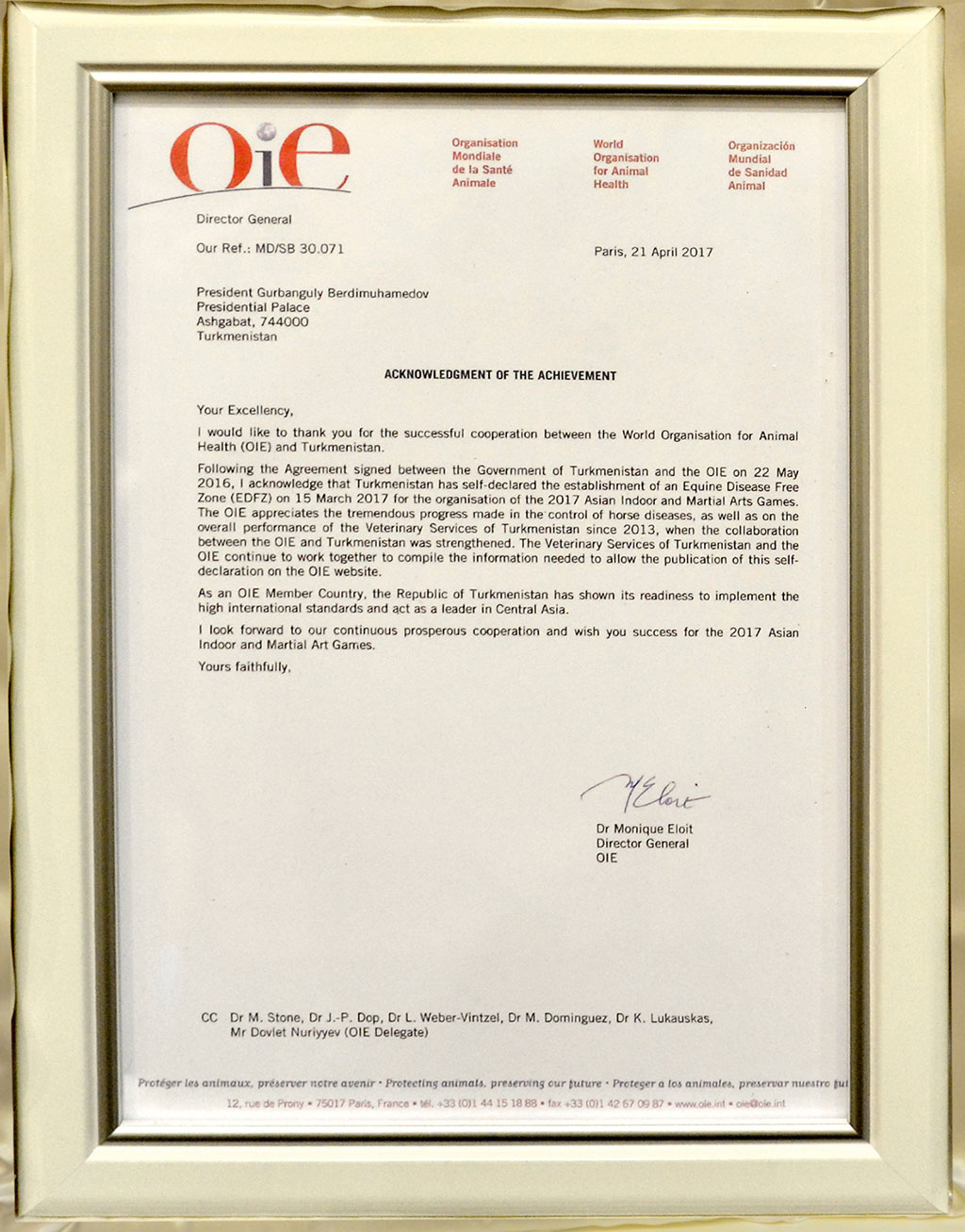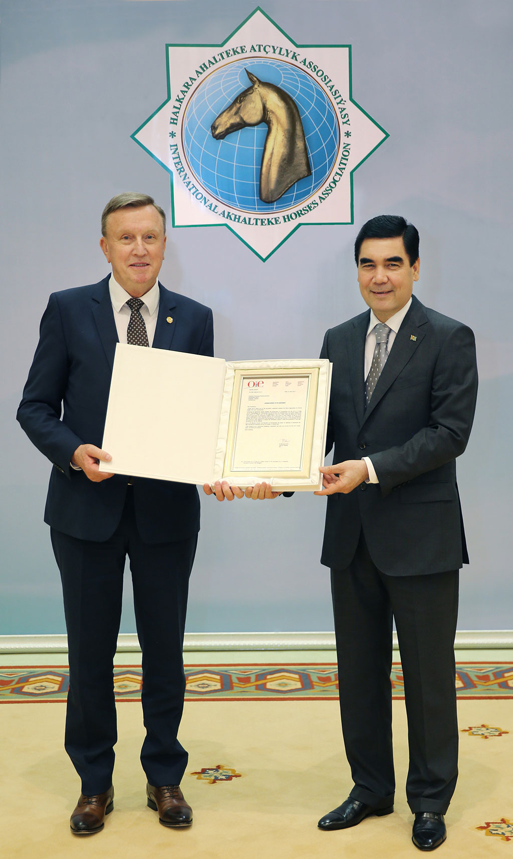 In the framework of the VII session of the International Ahalteke Horse Breeding Association, Regional Director of the International Office of Epizootics (IOE) for Central Asia Kazimiras Lukauskas awarded the certificate on the establishment of the Equine disease free zone (EDFZ) in Turkmenistan to President Gurbanguly Berdimuhamedov. The President of Turkmenistan expressed deep gratitude to Mr. Lukauskas and the World Organisation for Animal Health for awarding the certificate that grants the status of the Equine disease free zone to Turkmenistan. The certificate opens up wide opportunities for holding equestrian games in the framework of the V Asian Indoor and Martial Arts Games, the programme of which includes the show-jumping contests on the initiative of the President of Turkmenistan. The President of Turkmenistan congratulated horse breeders in Turkmenistan and foreign countries as well on this achievement. The Turkmen leader noted that the decision to grant the status of the Equine disease free zone to Turkmenistan vividly exemplified the high international authority of Turkmenistan and symbolized the trust and recognition of the emphatic success achieved by our country in the spheres of horse breeding and veterinary medicine. President Gurbanguly Berdimuhamedov emphasized that our country carried out systematic work on the further development of the horse breeding industry, modernization of its infrastructure, increasing the number of heads of pedigree Ahalteke horses, intensification of international cooperation in this sphere, popularization of various equestrian sports and national traditions of horse riding. The President of Turkmenistan underlined that we were proud of the trust of the Olympic Council of Asia that had delegated our country the right to host the V Asian Indoor and Martial Arts Games and we would apply every effort to hold the Asian Games at the high level so that all participants of this sports event could feel the warm hospitality of our people.
