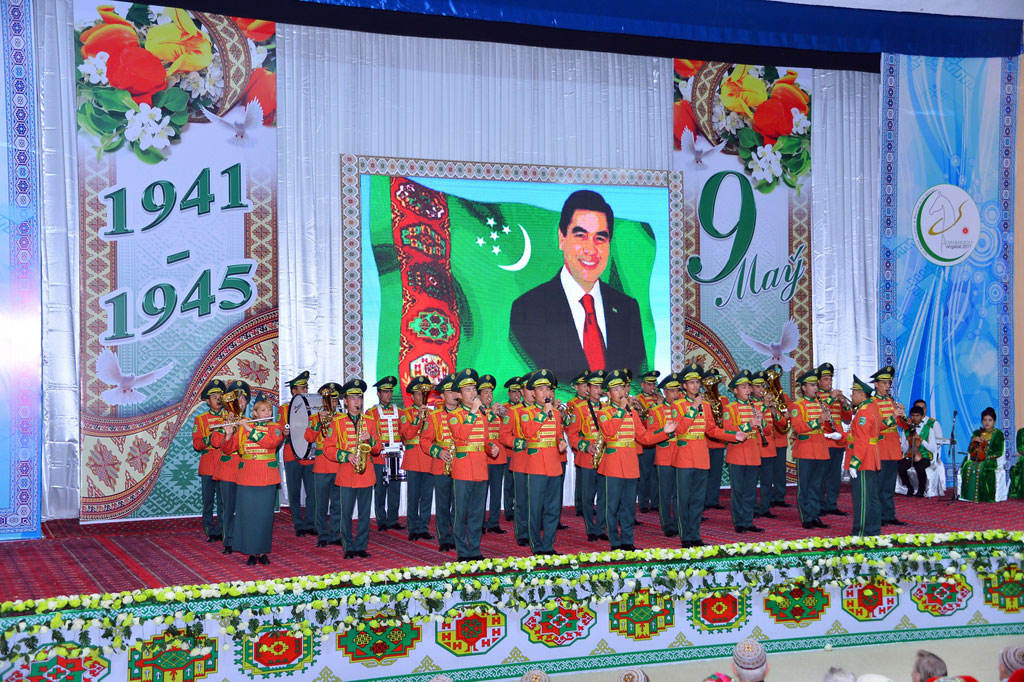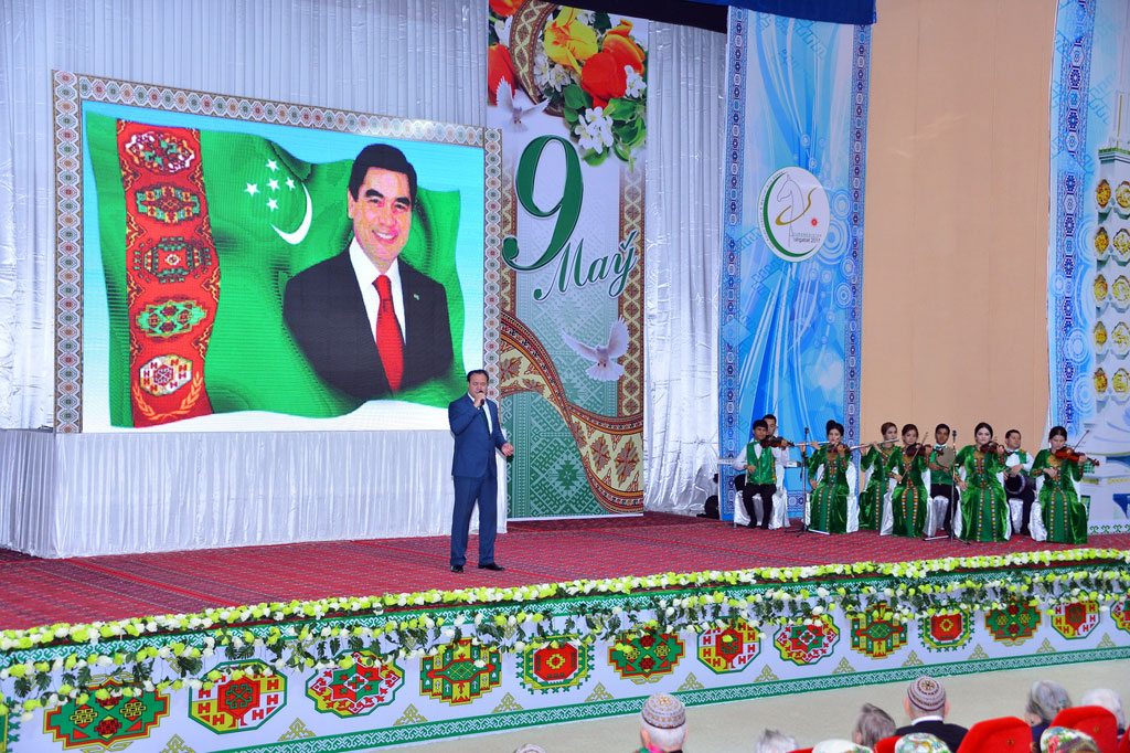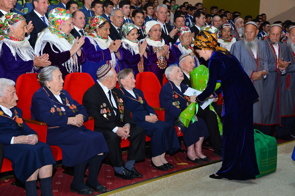 On behalf of President of Turkmenistan Gurbanguly Berdimuhamedov, they were awarded with monetary and valuable gifts and beautiful spring flowers. The Council of the Elders, the Ministry of Defence, public organizations of the country, administrations of the capital and region were the organizers of the solemn ceremony dedicated to the 72nd ceremony of the Great Victory. War veterans and soldiers’ widows, representatives of government organizations, military and law enforcement departments, universities, government employees, cultural workers and student were invited to the ceremony. Deep gratitude to the generation of the 40s for their unparalleled feat was expressed from the stage. Their fortitude and love of the native land deserves respect and will always serve as high moral example for young generation. In their speeches, the veterans and widows expressed the gratitude to President Gurbanguly Berdimuhamedov for care and attention to the participants of war and families of soldiers killed in battles. Owing to social benefits presented by the initiative of the Head of the State, all conditions for their deserving life were made. In solemn atmosphere, the veterans and widows of the heroes were presented with memorable gifts and flowers. After, the best music, folk and dance bands, famous singers and young artists demonstrated their skills and talent. The concert programme included the wartime songs, compositions of prominent Turkmen composers and modern authors, poems of famous poets of the country. The ceremony of honouring veterans and widows of killed warriors was also held in the state theatres of the regions. Traditional ceremonies of laying flowers to «Halk hakydasy» Memorial Complex, to the monuments of 1941 – 1945 war heroes of other cities of the country are to take place on the Victory Day on May 9. Concerts, theatre performances, art events and public festivals will be held on that day all around the country.