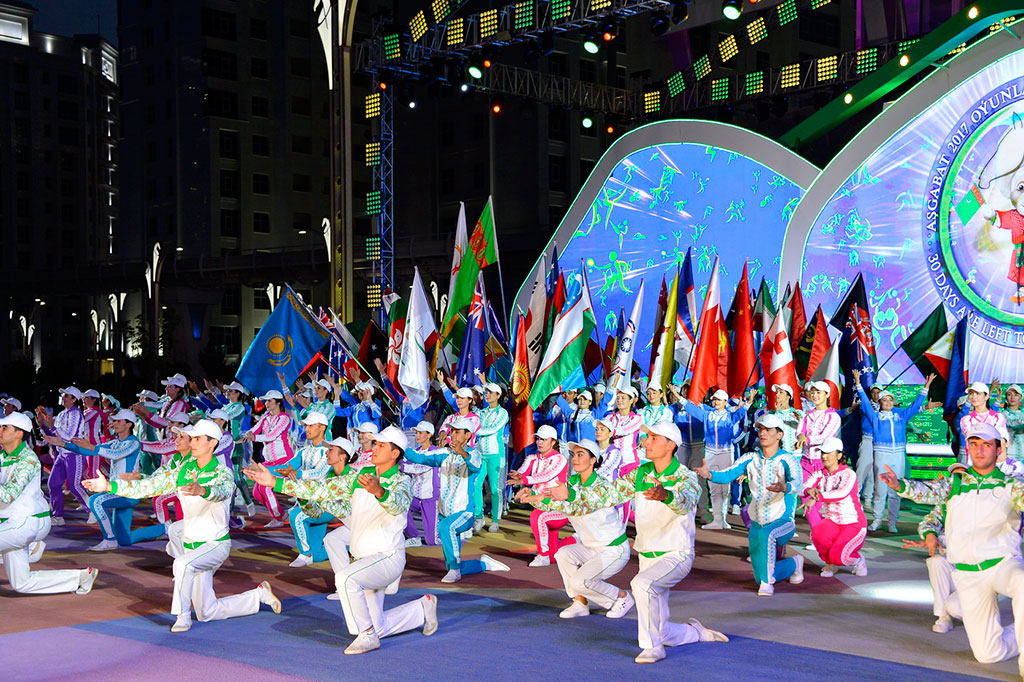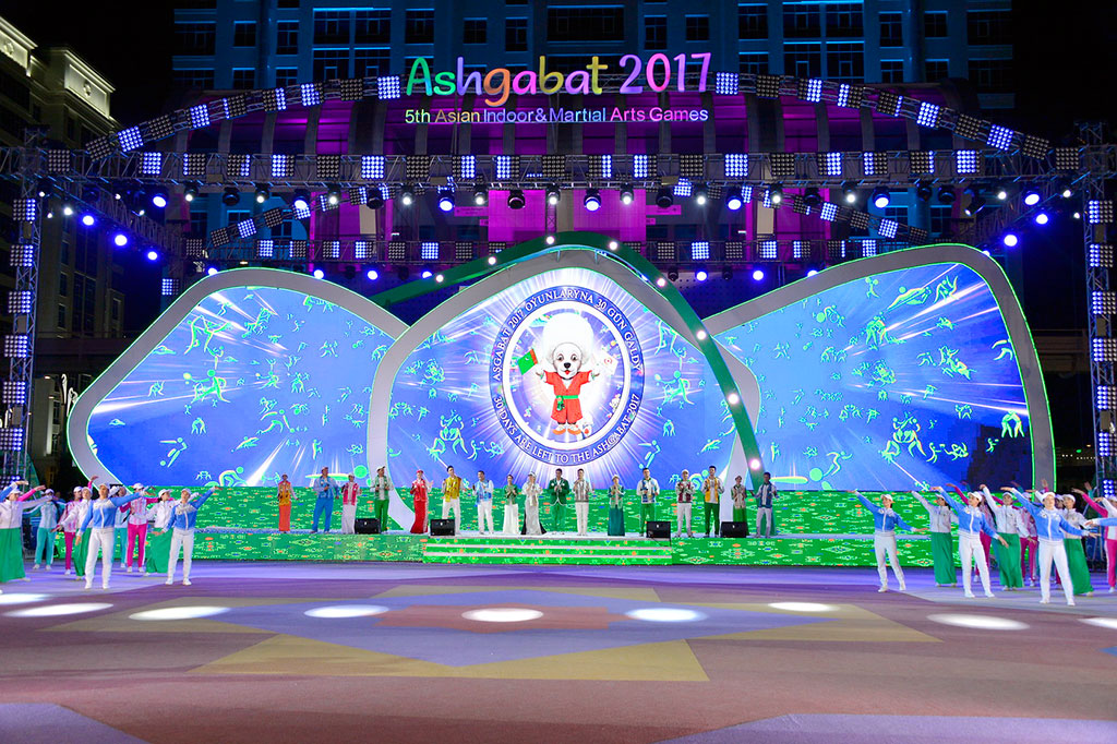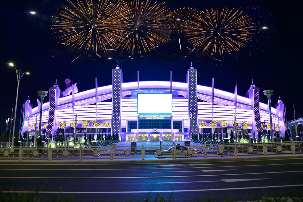 A dazzling concert by our country’s and foreign performing artists has topped off the eventful day, which marks one month until the 5th Asian Indoor and Martial Arts Games begin. President of Turkmenistan Gurbanguly Berdymuhamedov was a guest of honor at the spectacular event. For the first time ever, Turkmenistan hosts the mega sporting event. It is a great honor and enormous responsibility. At present, the people of Turkmenistan are closely united by the spirit of sport that is also displayed in preparations of the upcoming Games’ cultural events. Sport is movement and life! Sport is a direct path towards friendship, health and beauty! In the run up to the Games, the theme is dominant in local performing artists’ creative work. It was also the centerpiece in the program of the festive concert in the Olympic Complex organized on the open-air stage with modern graphic design. The concert boasted the wide application of innovative technologies that enable to make the most of the combination of lighting, sounds and colors. Video clips and graphics shown on giant on-stage video screens created greater spatial dimension, and gave a feeling of greater audience engagement in the festivity. A laser light show added an air of solemnity and luster to the event. The concert was opened by a song and dance composition, “Geliň, dostlar Aziada!” performed by pop singers, the State Choir, and joint musical bands and groups. Then, flags of the countries participating in the Ashgabat 2017 Games appeared on stage. The colorful performance featured sporting spectacles and elements of the Latin American dances included in the official sporting program at the Games. By changing their places, the performers were forming different words of greeting on stage and welcomed everyone to the Ashgabat 2017 Games in Turkmenistan. A number of performances devoted to the Games were premiered at the concert. They were accompanied by new video clips showcasing our country’s advances in the development of the sport of record, sports movement and high-technology sports infrastructure, as well as Turkmenistan’s tourism potential, and the ongoing preparations in Ashgabat for the region’s biggest-ever competition. The concert program also focused on the city host – the white marble-clad Turkmen capital. Songs, dances, and an impressive video film about the places of interest of Ashgabat and its outskirts, including video images captured by unmanned aerial vehicles, added color and created a positive mood. The action-packed festive event embodied the richness and national identity of modern Turkmen art, a broad range of its forms and the continuity of traditions. The concert also featured John Newmen, a pop singer, whose single “Love Me Again” peaked at number one on the UK Singles Chart in 2013. In Turkmenistan, people first met the British singer and musician at the concert organized in the Avaza National Tourist Zone in April to celebrate World Health Day. John Newman’s lively interest in our ancient and ever-young country, its extensive preparations for the multi-sport event on the continent brought him again to Turkmenistan with its national traditions of extending generous and warm hospitality to old and new friends. The concert ended with a grand finale – the song by the President of Turkmenistan “Öňe, öňe, diňe öňe, Jan Watanym Türkmenistan!” that has become the Ashgabat 2017 Games Anthem. The large audience was singing along to the patriotic song. The celebration culminated in a grand fireworks display, which illuminated the skyline of Ashgabat with dazzling myriads of colorful sparks.