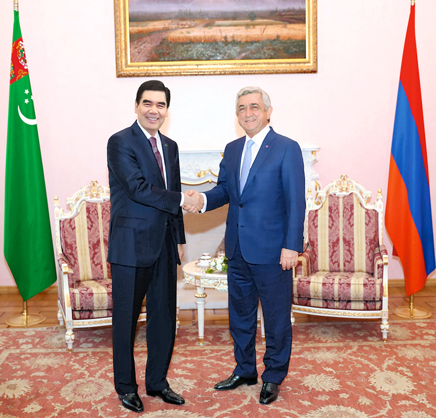 After the talks between the officials delegations of Turkmenistan and Armenia had concluded, the ceremony of signing bilateral documents took place. President of Turkmenistan Gurbanguly Berdimuhamedov and President of Armenia Serzh Sargsyan put their signatures on the Joint Communique. The Agreement on cooperation in the sphere of tourism, the Programme on cooperation in the sphere of culture and arts for 2018-2020, the Programme on cooperation between the Ministry of Foreign Affairs of Turkmenistan and the Ministry of Foreign Affairs of Armenia for 2018-2019, the Memorandum of Mutual Understanding on cooperation on the exchange of financial and intelligent information with regard to money laundering, predicate crimes and terrorism financing, as well as the Memorandum of Mutual Understanding on cooperation in the sports industry were signed at the presence of the leaders of the two states. The agreements on scientific and technical cooperation between the Institute of Seismology and Atmospheric Physics of the Academy of Sciences of Turkmenistan and the Institute of Geophysics and Engineering Seismology named after A.Nazarov of the National Academy of Sciences of the Republic of Armenia, between Magtymguly Turkmen State University and the Yerevan State University, between the Turkmen Agricultural University and the National Agrarian University of Armenia were concluded. The Memorandum on cooperation between the Institute of International Relations of the Ministry of Foreign Affairs of Turkmenistan and the Diplomatic School of the Ministry of Foreign Affairs of Armenia was also signed.