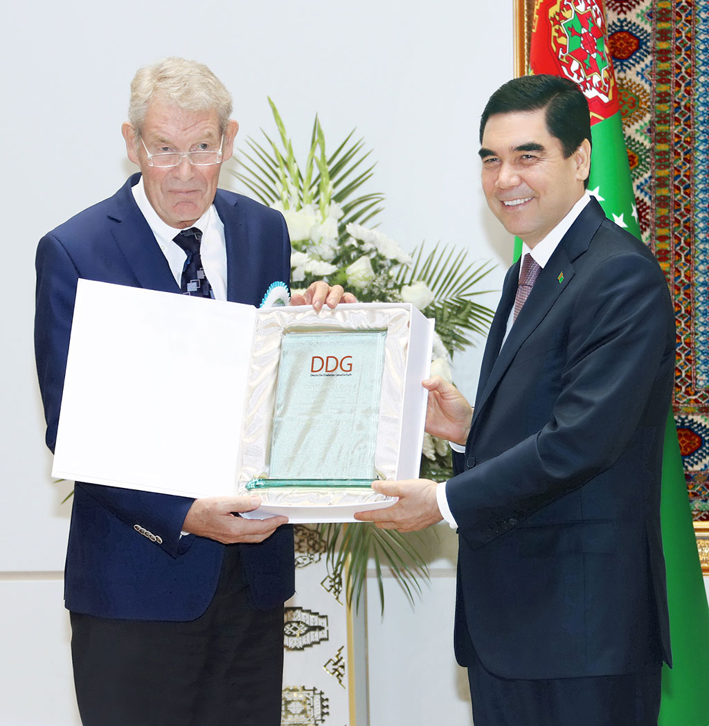 Conference hall of the International Surgery and Endocrinology Centre held the certificates award ceremonies of German Endocrinology Centre as well as of Health Care Fund to President Gurbanguly Berdimuhamedov. Welcoming the guests of the country, the Head of the State has said that, Turkmenistan observes big holiday – the Day of Knowledge and Student Youth, to which according to the tradition, the opening of new facilities is timed. The guests from other countries took part in current events, the Head of the State has said, having introduced Eni Sasko, the Doctor of Bordeaux University to the participants and given a floor for him to speak. Speaking to the participants, Doctor Eni Sasko noted growing activity in cooperation between Turkmenistan and foreign partners and international organizations in medical sphere. She has also highlighted the relation between the level of disease and environmental condition, having highly appreciated the efforts of Turkmenistan aimed at environmental protection, health of modern and future generations. These efforts are exemplary and can be a model for the governments and societies of many countries. Having expressed the gratitude for her speech, President Gurbanguly Berdimuhamedov gave floor to Professor of Cologne University, Head of Endocrinology Department Rudolf Maise. Mr. Maise noted the establishment of effective model of national health protection on the base of modern infrastructure and best developments of the world’s science, provision of high quality medical services, development of protection of maternity and childhood, assertion of healthy life style in the society and popularization of sports among the main successes of our country. Turkmenistan demonstrates high level of political responsibility and example in these subjects, - Rudolf Maise has said. During the event, Turkmen leader was presented with the certificates confirming that one of the awards is given to the endocrinology and Surgery Centre for the best provision of such clinics in the Central Asia and other for high level of medical services rendered to the patients with diabetes. In reply, the President expressed cordial gratitude to the guests for the award of the certificates of German Diabetes Diseases Association and the Fund of Health Protection.