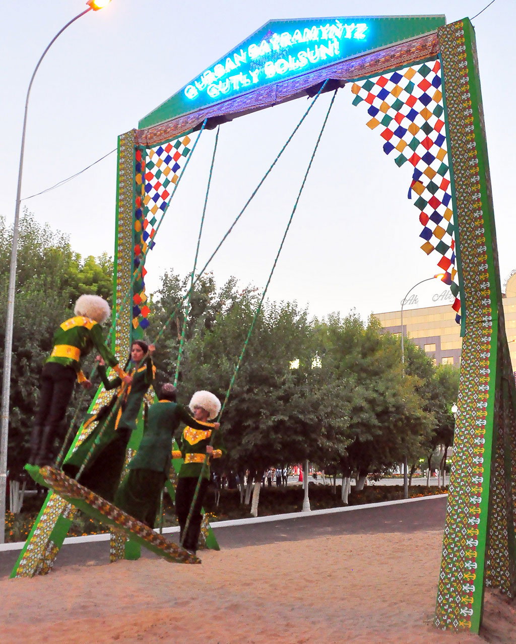 Turkmenistan started celebration of Gurban Bayram which will be marked for three days all over the country. According to tradition, on the first day, early in the morning in all mosques of the capital and regions a festive prayer - Bayram namaz is read. All people visit their relatives, friends and neighbours, receive guests, make offerings and in every house tablecloths are laid lavishly to observe this bright holiday. In honour of celebration of Gurban Bayram a rich cultural program was prepared. Everywhere - in parks, centres of culture and entertainment of the capital and regions festive actions and concerts are organized. It becomes especially populous near high swings installed as an integral national attribute of the holiday. On the improvised stages built near swings, famous actors of variety shows, folklore and dance groups perform their concert programs. The sending of pilgrims from Turkmenistan to Mecca and Medina for fulfilment of hajj on the eve of Gurban Bayram eloquently testifies to invariable adherence of our state to humanistic and spiritually-moral customs of ancestors, promotes recognition and popularisation of universal cultural, spiritual and moral values and national relics necessary for every nation and people.