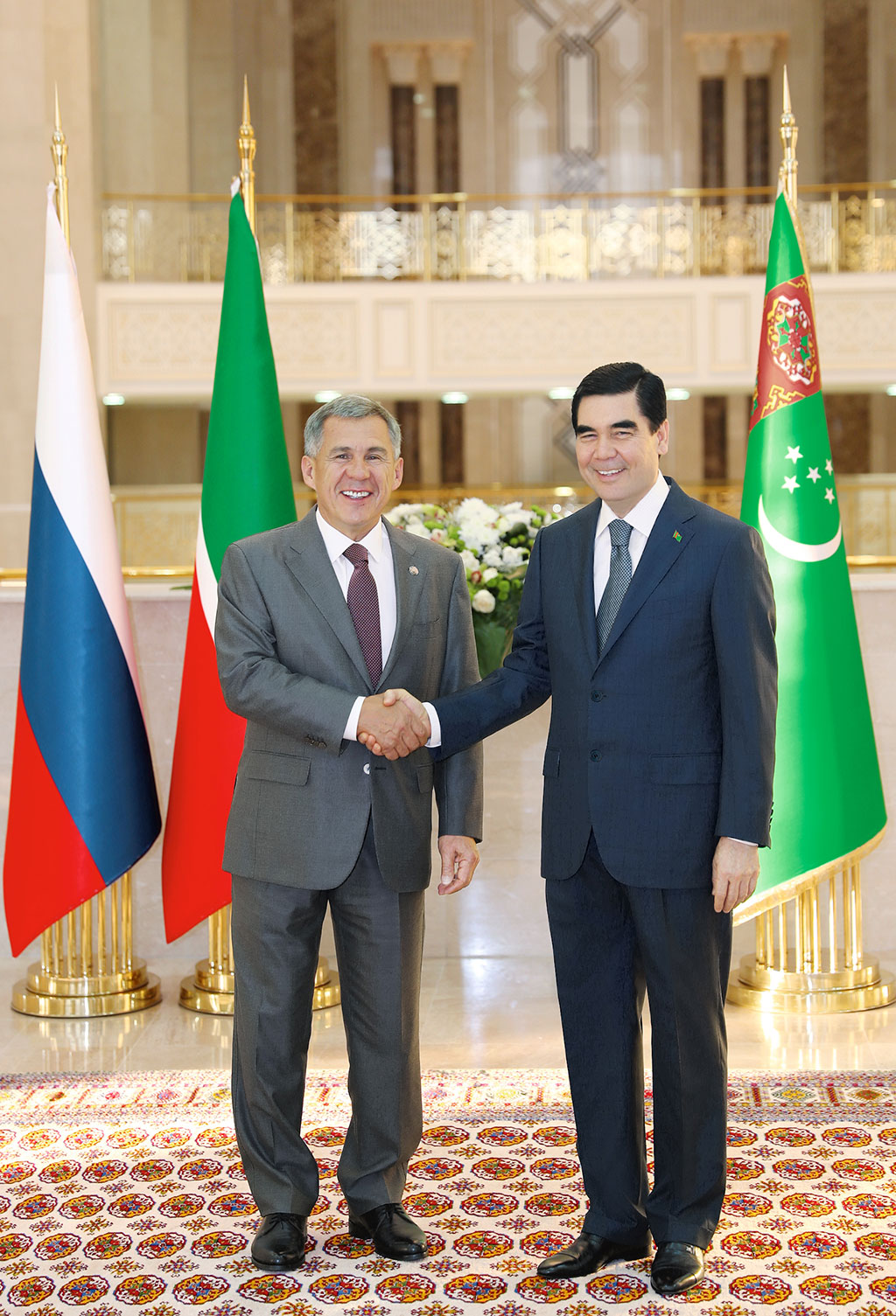 President Gurbanguly Berdimuhamedov met with President of the Republic of Tatarstan of the Russian Federation Rustam Minikhanov who arrived in Turkmen capital for participation in the opening ceremony of V Asian Indoor and Martial Arts Games. Warmly greeting each other, the Leader of Turkmenistan and the Head of the largest Russian region had joint photo on the background of State Flags. Congratulating President Gurbanguly Berdimuhamedov on the beginning of Ashgabat 2017 Games, the Head of Tatarstan expressed the confidence that this event would promote further growth of the interest to our country and improvement of its international authority. Rustam Minnikhanov noted that policy in sport sphere initiated by Gurbanguly Berdimuhamedov brings actual results – Turkmen sports enters quality new levels and the country becomes the place of prestigious international competitions. All of these give confidence that v Asian Indoor and Martial Arts Games in Ashgabat will be held on the highest level. Having expressed the gratitude for warm words, President Gurbanguly Berdimuhamedov noted fruitful character of bilateral cooperation, which is based on old relations, cultural and spiritual similarity of two nations and is being successfully developed under intergovernmental constructive dialog with the Russian Federation. During the meeting, the sides exchanged the visions on new opening opportunities of diversification of cooperation between Turkmenistan and the Republic of Tatarstan of the Russian Federation and noted the presence of considerable potential for beneficial consolidation of efforts in different directions. There are fuel and energy complex, trade and economic sphere, agriculture, tourism and sports among priority vectors. Special attention was paid to cooperation in cultural and humanitarian spheres, matters of expansion of the partnership between scientific and educational centres. Rustam Minnikahnov highlighted that established productive cooperation with our country is very important for Tatarstan where peace loving policy led by Turkmen leader and aimed at universal progress, peace and economic prosperity is highly appreciated and supported.