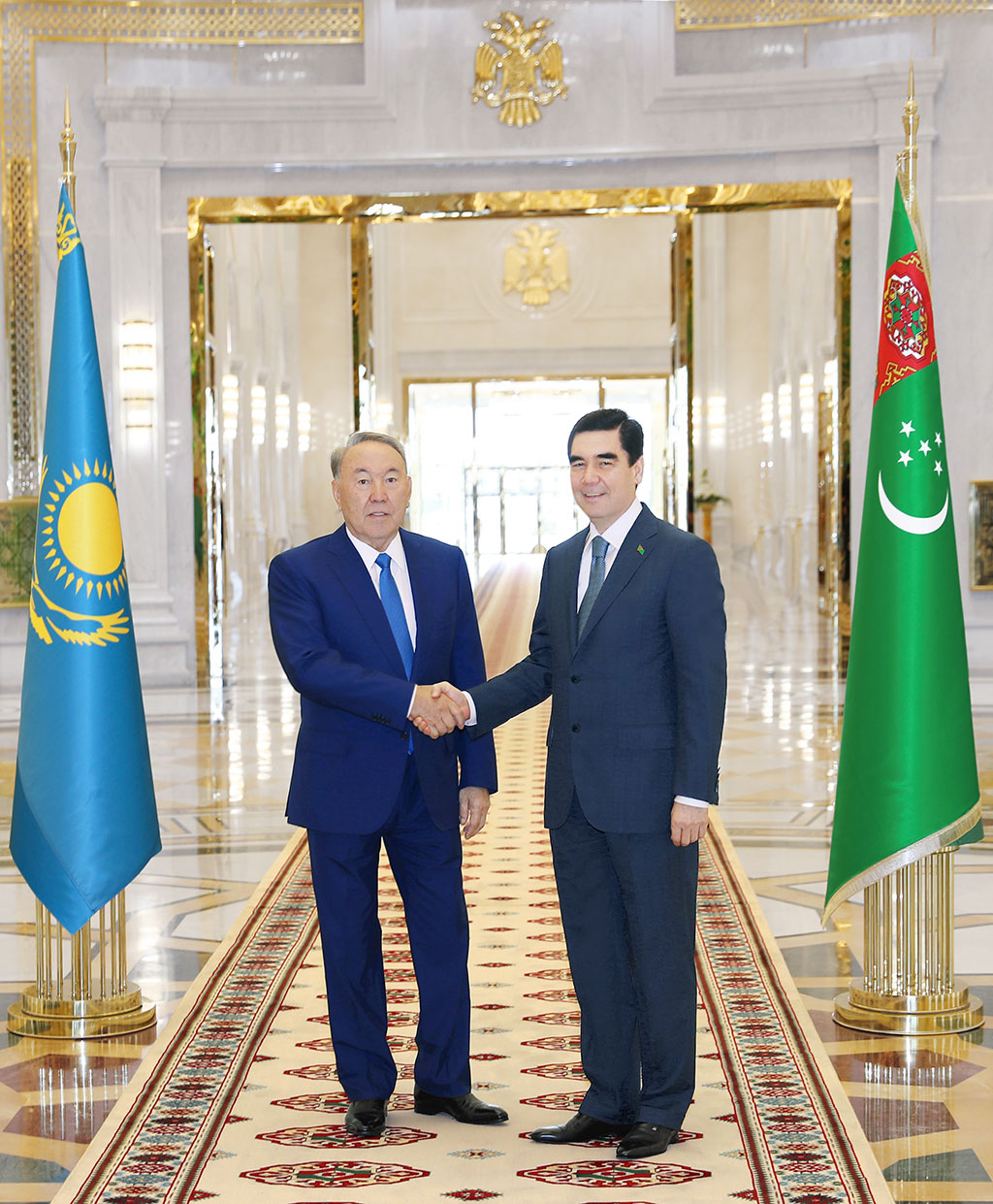 President of Turkmenistan Gurbanguly Berdimuhamedov met with the President of the Republic of Kazakhstan Nursultan Nazarabayev who arrived in our country for participation in large events on occasion of opening of V Asian Indoor and Martial Arts Games. Greeting each other, the Leader of two countries had joint photo on the background of the State Flags of Turkmenistan and the Republic of Kazakhstan. The Head of neighbouring state cordially congratulated the colleague on the beginning of international sport forum that is held for the first time in the Central Asia. Having highlighted that Ashgabat 2017 Games would be the event of huge historical significance, high-ranking guest noted special personal input of Turkmen leader to achievements of humane principles of the Olympic movement. President Gurbanguly Berdimuhamedov expressed the gratitude to President Nursultan Nazarbayev for accepted invitation to participate in the opening ceremony of V Asian Indoor and Martial Arts Games and stated with delight that bilateral relations between our countries are being dynamically developed. This is a good background for close cooperation under competent international structures, first of all under the United Nations Organization as well as for understanding of the main global and regional issues where Turkmenistan and Kazakhstan have same or similar approaches. In this context, Kazakh Leader highly evaluated constructive initiatives of President Gurbanguly Berdimuhamedov for solution of water and ecological range of problems and large work carried out by Turkmenistan as a Chairing country of International Fund for Saving of the Aral Sea. During the meeting, the Head of two states discussed current condition and prospects of interstate collaboration, outlined its priority directions and spoke for active consolidation of mutually beneficial trade and economic cooperation, expansion of business, humanitarian, scientific and educational contacts. It was emphasized that new stimuli to development of versatile bilateral cooperation were given during official visit of Turkmen leader Gurbanguly Berdimuhamedov to the Republic of Kazakhstan and to the capital of friendly country for participation in the opening ceremony of International Exhibition EXPO 2017 held in this year. Stating with delight existing potential of partnership in such strategic spheres as energy and transport, national leaders noted exclusive importance of the project of establishment of North – South transport corridor – the construction of Kazakhstan – Turkmenistan – Iran railroad. Built railroad becomes important link in formation of modern transport infrastructure, which would allow bringing economic and trade partnership between the Central Asian countries and neighbouring regions to new level. In the meantime, the Head of the State and his guest spoke for intensification of traditional cooperation in humanitarian spheres including culture, sports and Turkmenistan as well as for conducting of joint events and share of the experience in these fields.