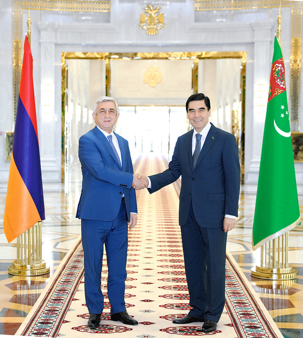 President of Turkmenistan Gurbanguly Berdimuhamedov met with President of the Republic of Armenia Serj Sargsyan who arrived in Turkmen capital for participation in the opening ceremony of V Asian Indoor and Martial Arts Games. Having warmly greeted each other, the Leaders of two countries had joint photo on the background of the State Flags of Turkmenistan and the Republic of Armenia. President Gurbanguly Berdimuhamedov expressed the gratitude to high ranking guest for acceptance of the invitation to visit Ashgabat and take part in the events on occasion of the start of Asian Games, having noted that Turkmenistan sees the republic of Armenia as perspective partner. President Serj Sargsyan highlighted that he is glad to visit Turkmen land and see modern achievements of people that confidently moves forward along the way of prosperity headed by their national leader. Having congratulated the Head of Turkmenistan on the opening of Ashgabat 2017 Games, high-ranking guest stated that their conduct would multiply international authority of Turkmenistan without a doubt. The Head of Armenia highlighted that the whole world watches with great attention for new achievements of modern Turkmenistan and hails progressive reforms in the country including in sports development. Excellent sport facilities and unique Olympic village built in Ashgabat cannot help making happy. Further in the meeting, the Leaders of friendly states discussed the matters of activation of Turkmen – Armenian relations and cooperation in different spheres. By unanimous opinion of the sides, the existing level of trust and mutual understanding allows Turkmenistan and Armenia confidently building their relations for long-term perspective. In this context, it was mentioned that official visit of the President of Turkmenistan to Armenia in August of this year opened new chapter in the development of Turkmen – Armenian dialog and would serve to consolidation of beneficial partnership. Having dwelt on trade and economic relations, the Leaders of two countries noted the role of Intergovernmental Turkmen – Armenian Commission for economic cooperation under definition of new forms for consolidation of productive partnership. Energy and transport spheres, textile industry, financial and banking system, agricultural complex, health protection were defined among the key directions. Actuality of opening of direct flight between Ashgabat and Erevan was expressed for consolidation of bilateral relations.