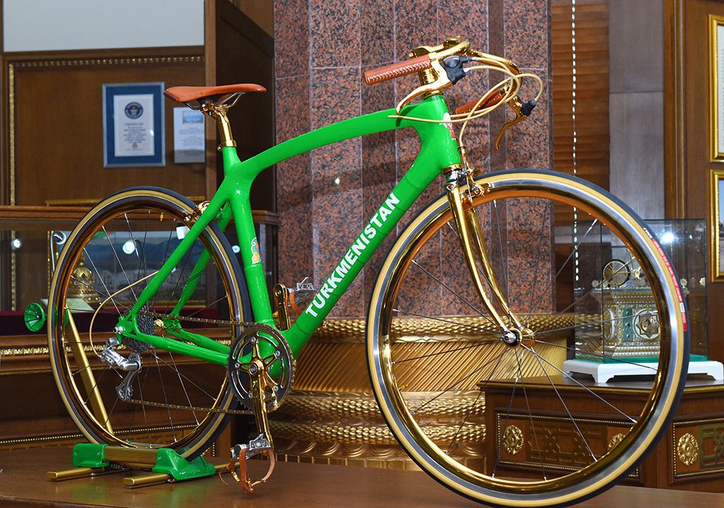 On behalf of the sportsmen and coaches participating in Ashgabat 2017 Games, President Gurbanguly Berdimuhamedov, who has initiated the Games and provided direct control of preparation of this grandiose event, was presented with the bicycle. The bicycle was handed over to the Presidential Museum of the State Museum. Citizens of of the capital, students, mass media and sport community representatives took part in the ceremony. Turkmen coaches and sportsmen handed over the present to the Presidential Museum of the State Museum of the State Cultural Centre of Turkmenistan where it occupied deserving place in national sports section. This section has the exhibits that have been presented to the Head of the State – the sportswear and several vehicles. The suit for Volkicar pilot is on the visible place. This gear was donned by the President when he skilfully drove racing car during the opening of the Automobile Transport Centre of the Ministry of Internal Affairs of Turkmenistan. It is made by one of the famous Italian companies and distinguished by original design and ergonomics. The same, above-mentioned Volkicar driven by the President is among the exhibits of national sports section. As is known, the Head of the State demonstrated his skills driving this vehicle bearing number 7 and won the race. There are hockey suit and stick, which were used by Turkmen leader during final match of junior tournament, in the collection. Large interest is risen by photo materials demonstrating bright moments that were described above and the comments to them. After handing over new present of Turkmenistan brand, the number of bicycles become 5 in the Presidential Museum. It was made of carbon metal and bamboo and decorated with giltin.