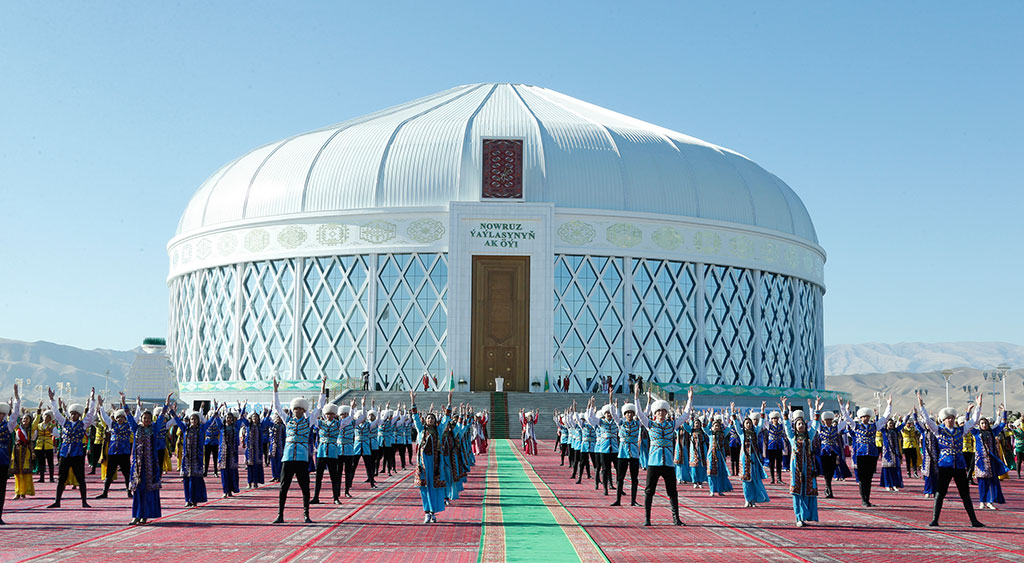 The opening ceremony of «Nowruz ýaýlasynyň ak öýi» facility was held in Ak Bugday etrap of Ahal Velayat with participation of President Gurbanguly Berdimuhamedov. The road from Ashgabat to the place of event was lined up with yurts where scenes of rural life were played and everything spoke of the coming celebration. Celebration atmosphere was highlighted by national music, numerous people were greeting the Head of the State and other participants of the ceremony. Turkmen village, welcoming and hospitable, has been built with all attributes of traditional life style next to «Nowruz ýaýlasynyň ak öýi». Cauldrons with cooking food has been steaming next to decorated yurts. There were camels led by the cameleer, animal enclosures, neatly stacked wood for fire beside. Everything was ready to start national celebration in the best traditions. There were traditional sweets and treats on the trays and traditional bread in the bags for the guests of this improvised settlement. Vivid picture was supplemented with sport competitions based on national games – Gyoresh wrestlers were pitting their strength against each other, young men were contesting in traditional amusement yaglyga tovusmak – who can jump higher to grab hanging headscarf. Big celebration seesaw was installed on the square in front of new building and lawns with bright green grass were spread around. Hundreds of people with flags and flowers were greeting the Leader of the Nation. There were aksakals, women of venerable age and young representatives of all velayats of the country, famous political scientists among them. Members of the Government, Leaders of the Mejlis, military and law enforcement agencies, ministries, departments and mass media, heads of diplomatic missions accredited to our country and Turkmen ambassadors overseas, hyakims of the velayats and Ashgabat, numerous residents of Ahal and Turkmen capital have gathered there. Everything is ready for coming opening ceremony and yovar – planting of greens, the celebration event for turning Turkmenistan into blossoming garden. It is remarkable that complex of new constructions on the ground for Novruz celebration has been built by private company. This is «Täze jaý» business entity, the member of the Union of Industrialists and Entrepreneurs of Turkmenistan. Today, the Union is entrusted with number of government and departmental orders for construction of social, industrial and infrastructural facilities. Level of professionalism growing every year among Turkmen construction business allows it not only coping successfully with huge work volumes in domestic market but also entering foreign markets developing the export of construction services. New facility that is put into operation is another remarkable project for the entrepreneurs, which are seen by the Head of the State as string transforming power that is able to bring the economy of country to leading positions in the world. Helicopter of the President of Turkmenistan has landed at the pad near new facility «Nowruz ýaýlasynyň ak öýi». At the gangway, girls in national dress presented flowers to the Head of the State. President Gurbanguly Berdimuhamedov accompanied by Deputy Chairmen of the Cabinet of Ministers of Turkmenistan, leaders of the Mejlis, military and law enforcement agencies, hrads of velayats and Ashgabat administrations went toward the building of «Nowruz ýaýlasynyň ak öýi» where artists were singing and dancing. The Head of the State made a speech for the participants. We widely and brightly celebrate Novruz Bayramy – the Spring Holiday, here, in the foothills of the Kopetdag every year. The origins of National celebration go far to the centuries. This is one of the most ancient of many nations including Turkmen one. And that is why, back in 2009, the UNESCO included Novruz to the List of Non-material Cultural Heritage of humanity and in 2010, the Resolution of the United Nations General Assembly announced March 21 as International Novruz Day, the President noted. Novruz is a precursor of peace, harmony, good-neighborliness, friendship and brotherhood, mutual understanding. We will always observe Novruz on the state level exactly in this place, the Head of the State highlighted. Our people think that to build a house and make one’s won hearth is an evidence of prosperity and sufficiency. New building on Novruz meadow will be original symbol of success and prosperity. In the future, we will be making decisions important for people and the country in this building and will be organizing public events next to it. Neutral Turkmenistan in one of dynamically developing countries of the world, the Head of the State continued. Our sovereign states, which neutral legal status was approved twice by the UN General Assembly, has successfully integrated into the number of economically developed states. We are proud of it by right. In this context, President Gurbanguly Berdimuhamedov noted that our neutral policy would be reflected in the basis of the events that are to be held in Ak Bugday Building on Novruz Meadow as its content includes such good traditions and friendship, solidarity, peace-loving and goodwill. This building will host regular session of the Council of the Elders of Turkmenistan on October 9 – 10. Taking advices for respected aksakals is one of the ancient Turkmen traditions. Regular session of the Council of the Elders will be an example of high level of political culture inherited from our ancestors. Strong families rely on the authority of the Elders; these are the elders who unite and consolidate the people. It became good tradition to consult with the elders in state administration and social relation improvement matters, the President of Turkmenistan said. Having reminded that the results of «Türkmeniň Altyn asyry» contest would be announced and award ceremony of the winners would take place in the Mukams Palace in the afternoon, the Head of th