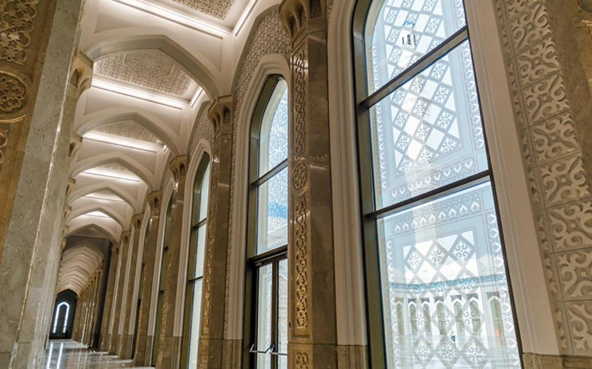 The mosque, which is the largest in Kazakhstan, was built on a land plot of 10 hectares. Its total capacity is 235 thousand people, of which 35 thousand believers can simultaneously pray in the halls, and 200 thousand people in the open air. The new cathedral mosque has four minarets 130 meters high each. One of the minarets in the left wing is open to visitors and tourists who can take the elevator to its observation deck. The height of the large dome of the mosque is 83.2 meters, the diameter is 62 meters. In the design of the spiritual temple, elements of the national Kazakh ornament and traditional Islamic decor, colored mosaics, and carpets were used.