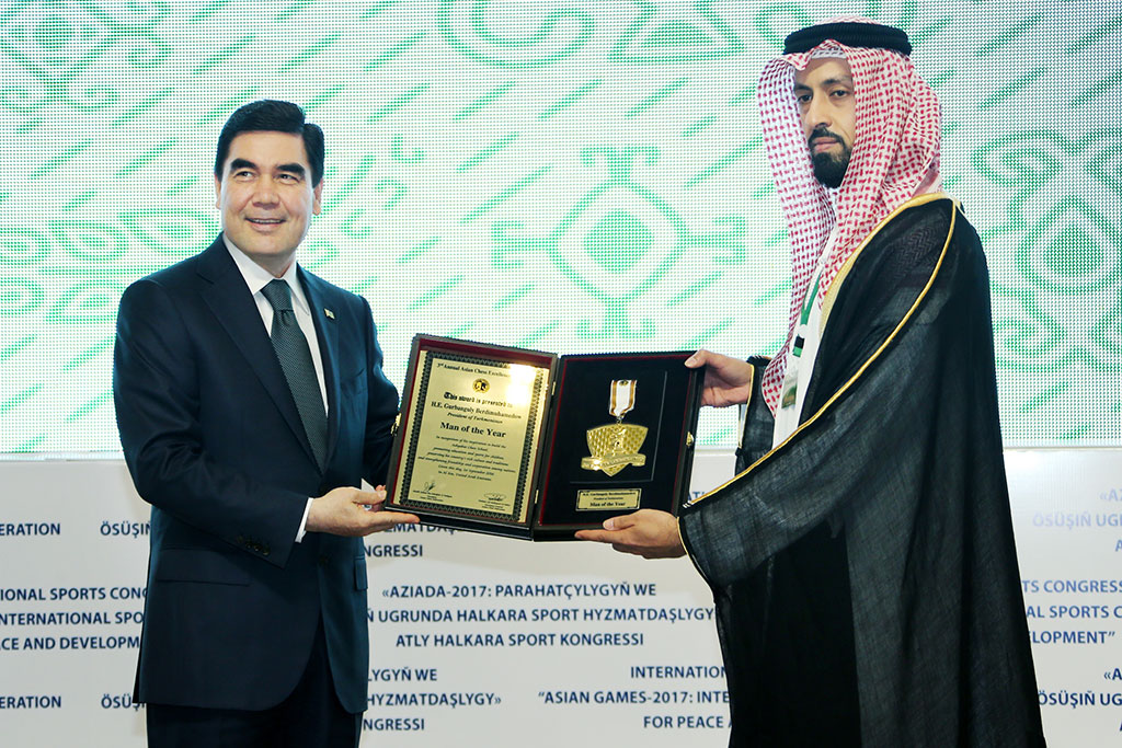Ceremony of awarding the President of Turkmenistan with the diploma conferring the honorary title ""Man of the Year"" was held during the congress ""Asian Games 2017: International Sport Cooperation for Peace and Progress"" in Avaza. The diploma was solemnly presented by the head of the Asian Chess Federation Sheikh Sultan Khalifa Sultan Shahbut Al-Nahyan. A representative forum that brought together delegates from the countries participating in the 5th Asian Indoors and Martial Arts Games, the heads of Olympic Council of Asia, international sports federations and organizations, and honorary guests - well-known politicians, is timed for World Health Day. The congress will consider the importance of the upcoming Asian Games in Ashgabat for the national sport and interstate cooperation, from the complex of social and economic spheres to the implementation of the peacekeeping strategy of Turkmenistan on regional and global scale.