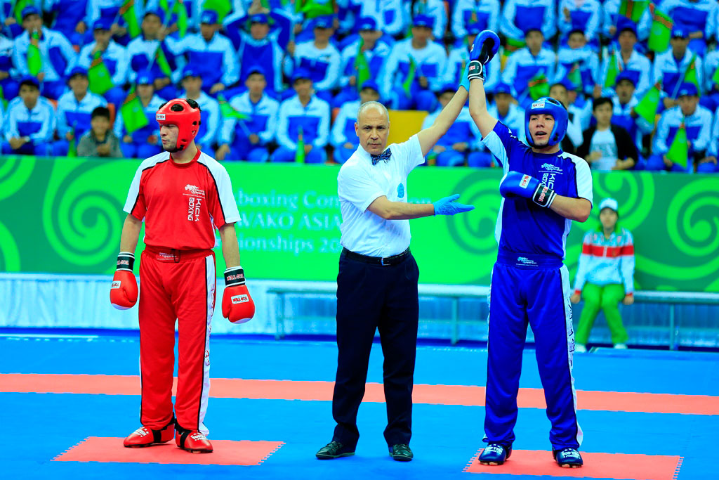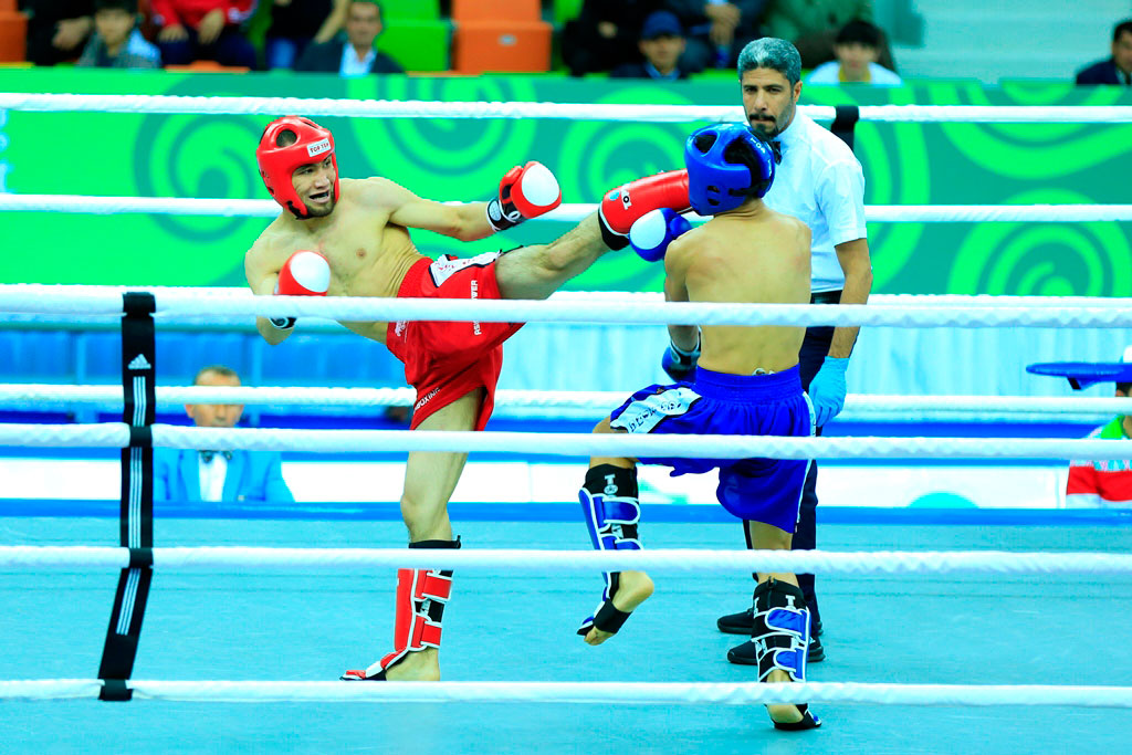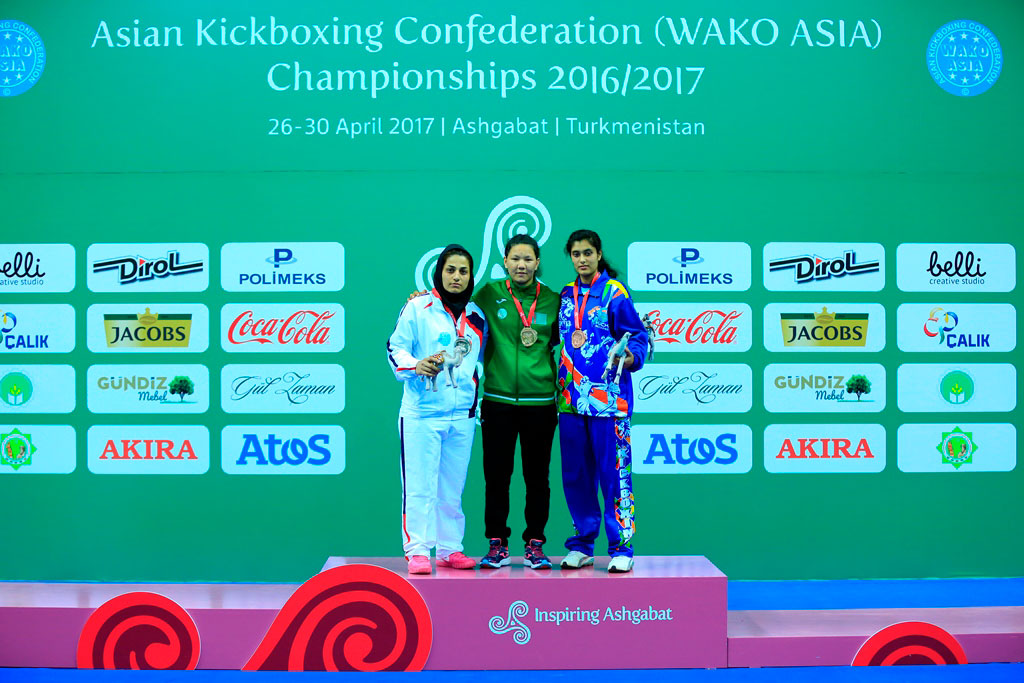 Almost 300 athletes from 17 countries compete for medals in the kickboxing tournament held in six combat categories – point fighting, semi-contact, kick light, low kick, full contact, and musical form style. Yesterday Turkmen athletes confidently topped the medal chart with six gold medals (for comparison, their closest pursuers, the Iran national team, had only two medals). Today, eight more top awards were added to our team’s medal count allowing our compatriots to maintain their leading position. The top of pedestal was occupied by Guych Gokov (57 kg) and Rustem Annaorazov (74 kg) in point fighting; Ysmayyl Atayev (63.5 kg), Serdar Mammedov (79 kg) and Gulzada Jorakuliyeva (65 kg) in kick-light; Gochmyrat Jumaniyazov (71 kg), Azamat Jumakuliyev (81 kg) and Azat Annayev (91 kg) in full contact. Thus, the medal count for the Turkmenistan National Team includes 14 gold, 13 silver and 23 bronze medals. Iranian athletes rank second in the overall standing with 13 wins, while Kyrgyzstan is third with 7 gold medals. The Asian Kickboxing Championship will conclude on 30th April, and then the final results will be announced.