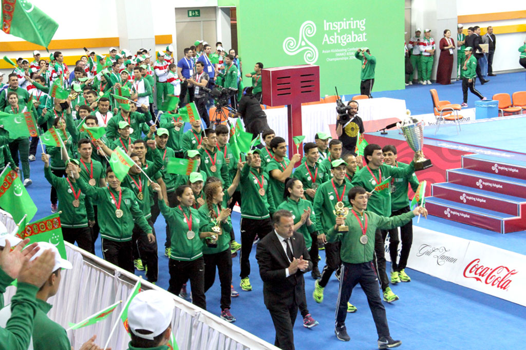 Asian Kickboxing championship finished in the Martial Arts Complex of the Olympic village. Turkmen sportsmen were the first in total count. Out compatriots won 27 gold, 25 silver and 23 bronze medals. Gulzada Jorakuliyeva was beyond the competition in full contact and low kick disciplines in weight category up to 65 kg and won two gold medals in the last day of the competitions. At the same day, Merdan Mamedov, Jelal Satguliyev, Gadam Abdiyev, Halmyrat Geldimamedov, Said Fakirov, Agamyrat Amangeldiyev, Muhammet Altybayev, Batry Chariyev, SHohrat Halliyev, Shohrat Yagmyrov and Farida Kutlymuradova added victories in the collection of the team. Iranian Kick boxers are on the second place with 22 gold medals in total count. Tajikistan is on the third place with 12 gold medals. The majority of the above-mentioned sportsmen are the fosters of Honoured Coach of Turkmenistan Alexander Snagovsky, who is the founder of Turkmen kickboxing school. Current success of Turkmen national team gives confidence that during V Asian Indoor and Martial Arts Games, which programme includes kickboxing, our team will win plenty of different medals. In the time remaining until V Asian Games, our sportsmen will have to go to number of training camps including international ones. The work of volunteers catering these competitions is also worth attention. President of Asian Kickboxing Federation Nasiri expressed the gratitude to voluntary assistant for coordinated and operative work. The Head of competent international sport organization also mentioned high organizational abilities of Turkmen specialists and expressed the confidence that forthcoming large complex competitions in Ashgabat in September will be held on the level meeting modern requirements of the world’s sports.