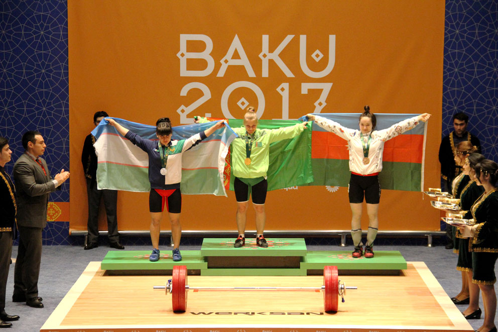 Gold and silver medals were gained by the Turkmen sportsmen in Baku at the 4th Islamic Solidarity Games, which gathered more than 3,000 athletes from 57 countries. Both awards were picked up in the weightlifting competitions. Also the capital of Azerbaijan, in the “Marriott” Hotel, hosted the presentation of the 5th Asian Indoor and Martial Arts Games forthcoming in Ashgabat. Polina Guryeva (weight class under 63 kg) coped with the 88-kg barbell in snatch, in clean and jerk – fixed 105 kg, having the total sum in double-event – 193 kg, became gold medal winner. Gulnabat Kadyrova (under 69 kg), the participant of the 2016 Olympics in Rio de Janeiro, whose final result was 224 kg (99 kg – snatch and 115 kg – clean and jerk), won silver award. In the discipline of “snatch” and in the total sum of double-event, Gulnabat has set up new national records. Let’s look back to the previous results. Mariya Lohova won a bronze medal in the judo tournament in the category under 70 kilograms. Another “bronze” was won in tennis, where the women national team – Jahan Bairamova, Anastasia Prenko and Guljan Muhammedkulieva, distinguished itself. Playing on the national team, by the high rate Merdan Ataev put himself on record, who at 100-meter distance got the title of vice-champion in swimming. On May 14, another Turkmen athlete – Horasan Imamkuliev (weight category under 60 kg) won a bronze medal in Boxing Competitions. Considering the current achievements, the sports team of Turkmenistan has already won five medals (a gold, two silver and two bronze) that seats our athletes in the top ten in the overall standings among 57 countries. In the framework of the 4th Islamic Solidarity Games, it was held the presentation of the 5th Asian Indoor and Martial Arts Games, organized by the Embassy of Turkmenistan in Azerbaijan jointly with the State Committee for Sport of Turkmenistan. It was marked the growing potential of Turkmen athletes. As an example, there were mentioned three Asian Championships – Kickboxing, Weightlifting and Swimming, held in Ashgabat in April, where the Turkmen sportsmen won 96 medals (30 gold, 32 silver and 34 bronze). There was also submitted an information about the architectural achievements of Ashgabat, entered the Guinness Book of World Records.