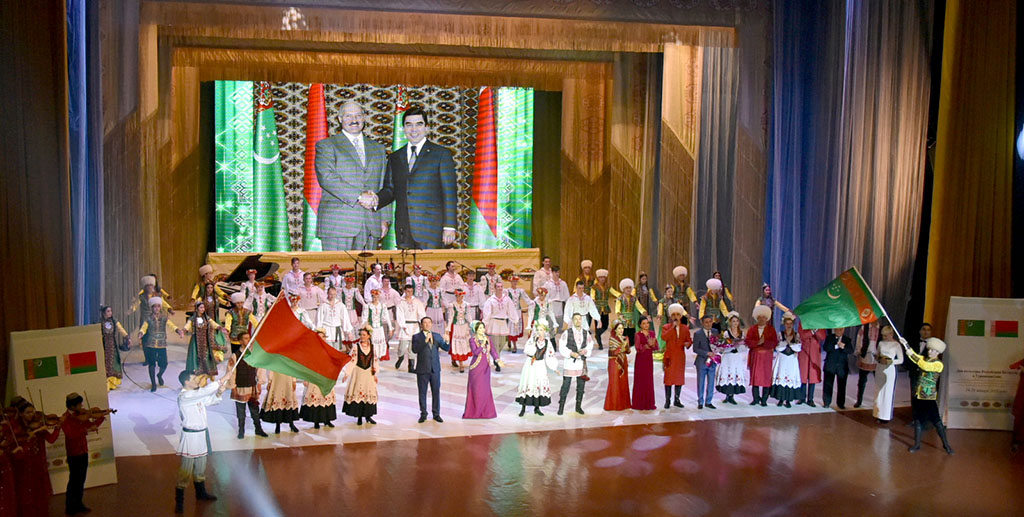 Состоялось торжественное закрытие Дней культуры Республики Беларусь в Туркменистане. Завершился праздник совместным концертом белорусских и туркменских артистов под сводами величественного Дворца мукамов. Масштабная творческая акция отразила стремление братских народов и их лидеров Гурбангулы Бердымухамедова и Александра Лукашенко к дальнейшему развитию дружественных связей, имеющих глубокие исторические корни и добрые традиции. Различные мероприятия, проведённые в рамках форума, значительно расширили контакты двух стран в гуманитарной сфере. Ашхабадцы и гости столицы познакомились с многообразием народных обычаев, современным хореографическим и музыкальным искусством Беларуси. Большой интерес вызвала фотовыставка, рассказывающая о сегодняшнем дне дружественной страны. Состоялся также показ кинолент, вышедших на студии Беларусьфильм. Среди них – драма «Волки», снятая в 2009 году режиссёром Александром Колбышевым по одноимённой повести Александра Чекменёва и удостоенная наград кинофестивалей, а также фильм в жанре фэнтези «Рыжик в Зазеркалье» (2011) режиссёра Елены Туровой. Дни культуры Республики Беларусь в Туркменистане вылились не только в ряд творческих мероприятий, но и в заинтересованное общение коллег, чрезвычайно важное для дальнейшего развития многопланового сотрудничества. Знаменательным моментом стала передача Государственной библиотеке Государственного культурного центра факсимильного издания «Книжное наследие Франциска Скорины». Подготовка 22-томного собрания была приурочена к 500-летию белорусского и восточнославянского книгопечатания, а само это событие, имеющее мировое значение, занесено в календарь памятных дат ЮНЕСКО. В издании представлены произведения 1517-1522 годов. Отныне эта уникальная коллекция, знакомящая с ценным пластом истории и культуры братского народа, будет доступна туркменским читателям. В стенах главного книгохранилища страны состоялась встреча с сотрудником белорусского журнала «Полымя» поэтессой Юлией Алейченко, известной своими переводами туркменских авторов. Она рассказала собравшимся о публикациях данного журнала, посвящённых туркменским писателям, сообщив, что в Беларуси изданы произведения около двух десятков наших соотечественников и литературное сотрудничество успешно продолжается. Вместе с тем, гостям была предоставлена возможность ознакомиться с тенденциями развития туркменской культуры и искусства, посетить новые профильные объекты, музеи столицы. Для белорусской делегации также было организовано посещение Государственного цирка, где состоялось выступление прославленного коллектива «Туркменджигитлери». С особым восторгом отзывались деятели культуры дружественной страны о посещении Ахалской долины. Здесь был разбит туркменский аул с многочисленными юртами, хозяева которых гостеприимно приглашали белорусских друзей к достарханам, угощали свежеиспечённым чуреком и национальными блюдами. Кроме того, проходили своеобразные мастер-классы музыкантов, а зажигательные обрядовые танцы объединили представителей искусства двух стран в один дружный хоровод. Творческий союз нашёл своё продолжение сегодня в совместном концерте на сцене Дворца мукамов. Ему предшествовала церемония закрытия культурной акции. В ходе торжества собравшиеся в