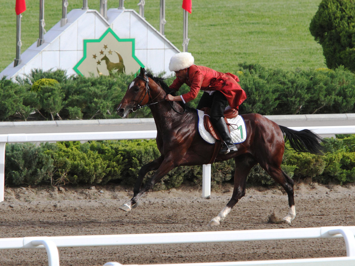 В Ахалтекинском конном комплексе, где сегодня прошли большие торжества по случаю Национального праздника туркменского скакуна, состоялись состязания среди наездников-наставников. В числе почетных зрителей соревнования - Президент Гурбангулы Бердымухамедов, члены правительства, иностранные дипломаты и другие гости, прибывшие из-за рубежа, в том числе представители СМИ. С самого начала и практически до конца захватывающего зрелища за состязанием опытных мастеров было трудно предсказать бесспорного претендента на победу, силы были практически равны. Летящие кони, казалось, неудержимы и неукротимы, но они составляют единой целое со своими всадниками. Такого полного слияния со своим железным «конем» не может добиться пилот скоростного болида. А на скачках в игру вступают не только технический расчет и скорость, но и факторы живого контакта, взаимной веры друг в друга наездника и скакуна и еще непостижимые стороннему наблюдателю вещи, которые превращают эту пару человека и животного в сгусток управляемой энергии. В скачках на дистанцию в 1200 метров участвовало семь наездников-наставников на конях 4-летках и старше. И первым из них пришёл к финишу гнедой скакун Армангала из Ахалтекинского конного комплекса. Наездником был Нурмухаммет Ходжанепесов, который и стал победителем - ему от имени Президента Туркменистана в торжественной обстановке была вручена главная награда состязаний.