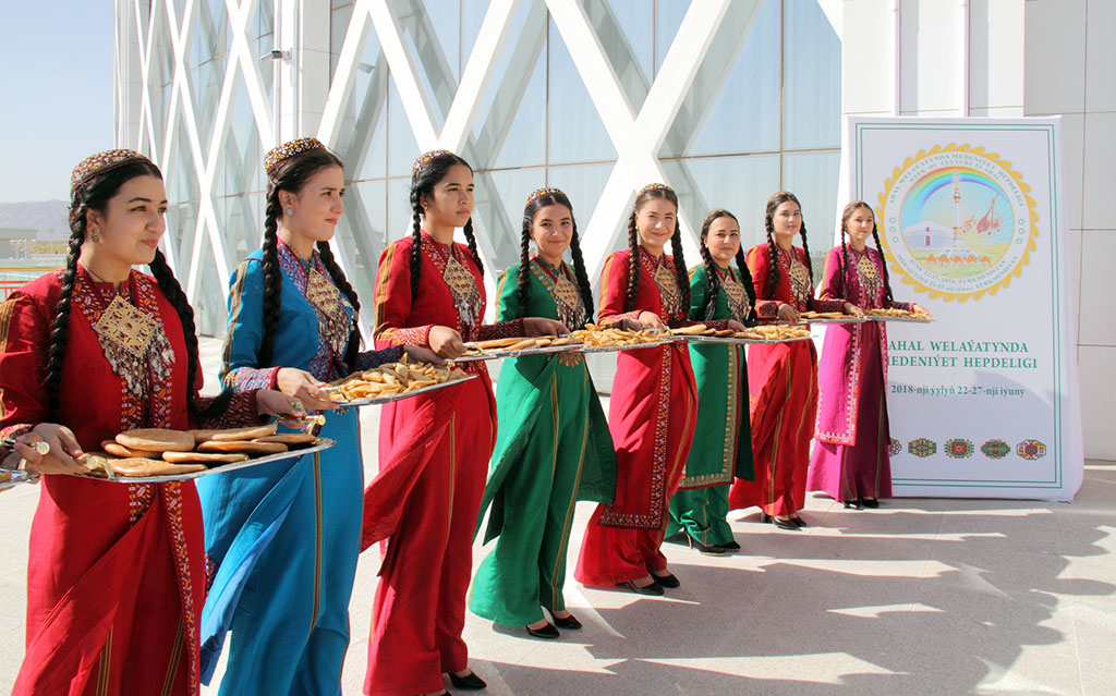 В долине Ахала, в здании «Nowruz ýaýlasynyň ak öýi» состоялось торжественное открытие Недели культуры. Масштабная творческая акция ежегодно проходит в разных регионах страны, демонстрируя яркую палитру и многообразие отечественной культуры, приобщая людей к её ценностям, выявляя новые таланты. Этот форум искусств является и своего рода отчётом о проводимой работе в различных направлениях развития культуры, и, прежде всего, по сохранению, изучению и широкой популяризации в мире духовного наследия туркмен, стимулированию профессионального роста тружеников творческого цеха. Культура в самом широком понимании этого слова определяет идейное содержание всех преобразований в стране, их ценностные ориентиры, а вопросы политики в гуманитарной области находятся в поле неослабного внимания Президента Гурбангулы Бердымухамедова. Время подтверждает необходимость и значимость ежегодной культурной акции, включающей в свою орбиту все направления национального искусства. Форум приурочен ко Дню работников культуры и искусства, который в текущем году, в соответствии с Указом Президента Туркменистана, объединён с праздником поэзии Махтумкули Фраги, что подчёркивает преемственность духовной связи поколений. Нынешняя Неделя культуры озарена девизом года «Туркменистан – сердце Великого Шёлкового пути». Современное Туркменское государство, сохраняя и приумножая великое духовное наследие предков, вносит весомый вклад в сокровищницу общечеловеческой цивилизации. В текущем году эстафету проведения Недели культуры принял Ахалский велаят. Его территория, наряду с другими регионами страны, изобилует памятниками, являющимися важными звеньями на Великом Шёлковом пути, а музеи хранят бесценные свидетельства древней истории и культуры туркменского народа, его беспримерного мужества и героизма. Церемония открытия Недели культуры-2018 состоялась в живописной Ахалской долине, в этрапе Ак бугдай – также знаковом месте для истории нашей страны. Этот край хранит пласты древних цивилизаций. Ещё тысячелетия назад здесь процветала высокая культура земледелия, именно в предгорьях этого региона стали возделывать пшеницу, здесь берёт истоки легендарная ахалтекинская порода коней. Бережно сохраняемые культурные ценности и традиции предков развиваются и выступают важным фактором международного гуманитарного сотрудничества. Не случайно в Ахалской долине ежегодно проводятся мероприятия Национального праздника весны – Международного дня Новруз, символизирующего мир, согласие, добрососедство и дружбу. С этим связано современное название местности и воздвигнутого здесь здания «Nowruz ýaýlasynyň ak öýi» в виде белой юрты как образа гостеприимства туркмен, самобытного историко-культурного достояния нашего народа. Праздничная атмосфера царит на площадке «Nowruz ýaýlasy», где собрались многочисленные гости торжества. В составе делегаций, участвующих в Неделе культуры, – известные театральные артисты, эстрадные и народные исполнители, специалисты музейного и библиотечного дела, художники и писатели, профессиональные ансамбли и популярные фольклорно-этнографические группы со всех регионов страны. Около «Nowruz ýaýlasynyň ak öýi» установлены нарядные юрты, рядом искусные мастерицы занимаются рукоделием, прядут шерсть, валяют кошмы. Под открытым небом развёрнут