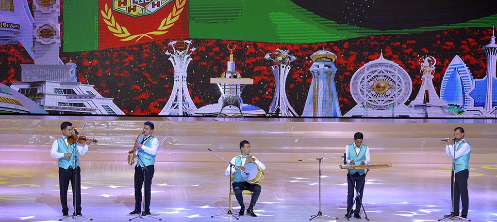 В столичном Центре конгрессов состоялся концерт мастеров искусств, посвященный 27-й годовщине независимости страны. В зале собрались члены правительства, руководители Меджлиса, военных и правоохранительных органов, общественных организаций, главы аккредитованных в Туркменистане дипмиссий и международных организаций, послы нашей страны в зарубежных государствах, старейшины, представители министерств и ведомств, научной и творческой интеллигенции, СМИ, студенческая молодёжь, делегаты первого заседания Халк Маслахаты со всех регионов. В числе зрителей – участники XXI конференции Гуманитарной ассоциации туркмен мира, а также многочисленные иностранные гости, прибывшие в Ашхабад по случаю праздничных торжеств. Многие из присутствующих удостоены высоких государственных наград, вручённых сегодня в честь 27-й годовщины независимости Туркменистана. Открыла грандиозное представление литературно-музыкальная композиция, объединившая на сцене представителей разных направлений искусства. Эта патетическая ода сопровождалась видеорядом, посвящённым достижения независимого нейтрального Туркменистана. Программа концерта отличалась разнообразием жанров и премьерных номеров, отражающих богатейший потенциал и преемственность традиций национального искусства. Её тематическое содержание и идейный посыл были связаны с девизом нынешнего года – «Туркменистан – сердце Великого Шёлкового пути». Торжественное начало концерта на сцене Центра конгрессов было поддержано ярким выступлением фольклорного коллектива «Dokmaçylar», приглашающего всех друзей нашей страны разделить радость замечательного праздника. Композицию, наполненную национальным колоритом, искренностью детского творчества, задором, представили зрителям победители общенациональных конкурсов «Garaşsyzlygyň merjen däneleri» и «Ýaňlan, Diyarym!», а также детские танцевальные ансамбли «Ruhubelent çagalar» и «Joşgün». Затем со сцены прозвучали лучшие произведения музыкальной классики, народные дестаны, демонстрировались современные хореографические композиции, отражающие спортивный дух нашей эпохи. Зал рукоплескал виртуозному выступлению барабанщиков, зажигательным эстрадным ритмам. Бурные аплодисменты заслужило выступление фольклорных коллективов со всех велаятов страны, в которой отразилось многообразие творческих традиций туркменского народа.