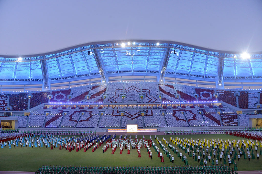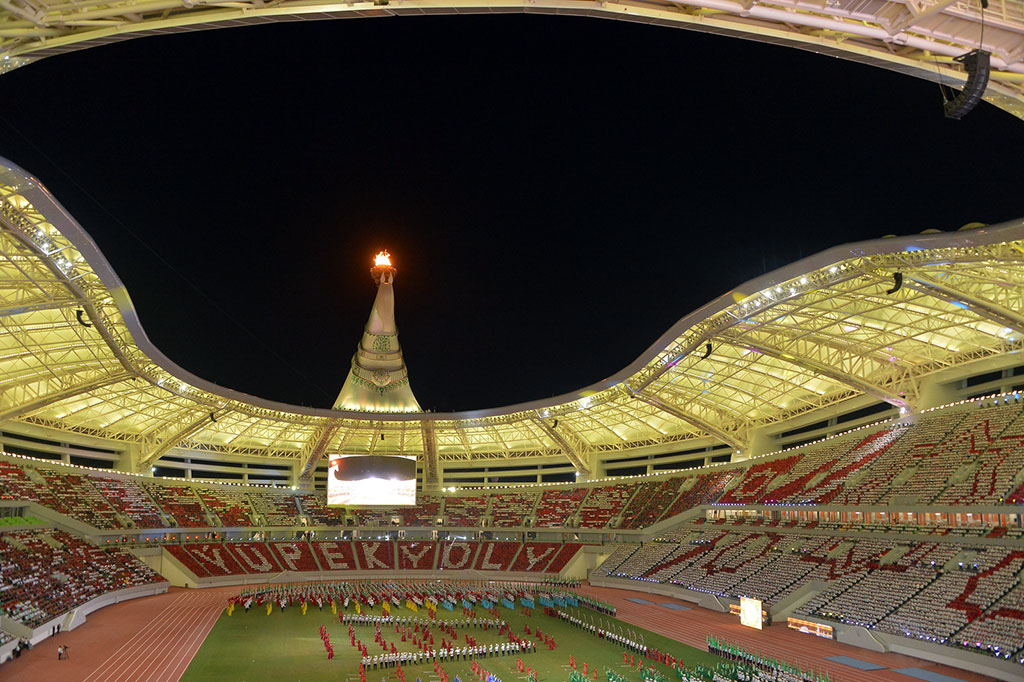 Сегодня вечером при участии Президента Гурбангулы Бердымухамедова на стадионе столичного Олимпийского городка состоялось торжество, посвящённое Дню независимости Туркменистана. В руках зрителей и участников праздника – Государственные флаги Туркменистана, разноцветные шары. Всё готово к началу большого шоу. Наступает торжественный момент. Звучат фанфары, возвещающие о начале праздника. В центре спортивной арены танцовщицы в красных одеяниях образовали два кольца, а в его центре девушки в белой одежде образуют цифру «XXVII». Группы, состоящие из представителей велаятов, в национальной одежде в соответствии с цветами каждого велаята, формируют политическую карту независимого нейтрального Туркменистана. Звучит Государственный гимн. В небо взмывают сотни воздушных шаров, переливающихся всеми цветами радуги, а над головой гигантского скакуна, украшающего купол Олимпийского стадиона, вспыхивает факел. На арене стадиона одна за другой оживают изображения исторических памятников древних городов Амуль, Мерв, Ниса, Дехистан, Куняургенч, описанных в книге Президента Гурбангулы Бердымухамедова «Туркменистан – сердце Великого Шёлкового пути». На огромном экране, установленном на стадионе, идёт показ видеоролика, связанного с этим историческим маршрутом, который сегодня возрождается в новом формате. На площадке стадиона появляются изображения караванных путей, идущих со всех уголков Туркменистана. Участники действа, одетые в костюмы купцов и путешественников, собираются в центре спортивной арены, перенося нас в воображении на тысячелетие назад. Далее на мониторе стадиона начинается показ видеоролика, повествующего уже о современном Туркменистане, в котором осуществляются грандиозные по размаху инфраструктурные проекты – прокладываются новые железнодорожные пути, автомобильные дороги и магистральные трубопроводы, которые возрождают Великий Шёлковый путь в новом формате. Тему ролика творчески продолжают фольклорно-танцевальные коллективы, изображающие художественные образы данных проектов, а в завершение своего выступления формируют образ воздушных ворот Туркменистана – Международного аэропорта Ашхабада. Затем в центре огромной арены юноши и девушки создают образ головы и подковы коня, – символа Азиады-2017. Танец джигитов, воссоздавая образ исконно славящихся отточенным мастерством верховой езды туркменских всадников, которые продолжают традиции своих предков, поражают всех зрителей своей удалью и сложнейшими трюками, блестяще исполняемыми с безупречной технической точностью и неподражаемым артистизмом. Эстафету праздничного представления принимает многочисленная колонна туркменских спортсменов, за считанные мгновения превратившая поле стадиона в Олимпийский городок и арену для демонстрации показательных выступлений по десяткам видам спорта. В середине площадки спортсмены исполняют композицию, символизирующую легкоатлетический кросс и авторалли «Амуль-Хазар 2018», Чемпионат мира по тяжёлой атлетике, который пройдёт в Ашхабаде в ноябре этого года. Кульминацией праздника стало исполнение творческими коллективами пяти велаятов танца куштдепди, внесённого в Список нематериального культурного наследия ЮНЕСКО. Праздничное торжество близится к концу. Под финальную песню в центре на спортивной 