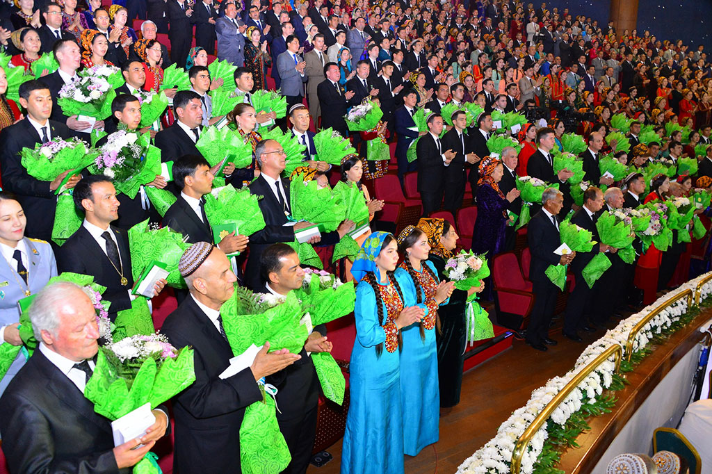 Сегодня в столичном Дворце Мукамов состоялась торжественная церемония чествования творческих работников, удостоенных почетных званий Туркменистана, и лауреатов конкурса на соискание премии главы государства «Türkmeniň Altyn asyry» среди деятелей литературы, культуры и искусства. С большим воодушевлением заслушали участники торжества Обращение Президента Туркменистана, адресованное творческим работникам по случаю присвоения им почётных званий и присуждения престижной премии «Türkmeniň Altyn asyry». Затем были зачитаны Указ о присвоении почётных званий и Постановление о награждении победителей общенационального конкурса «Türkmeniň Altyn asyry». Один за другим поднимаются на сцену руководители творческих коллективов, поэты и прозаики, певцы и музыканты, мастера изобразительного искусства и представители СМИ. Обладатели почетных званий и лауреаты конкурса выражали признательность Президенту Гурбангулы Бердымухамедову за высокую оценку их труда, создание условий для полноценной творческой деятельности. Затем на сцене Дворца мукамов развернулось праздничное действо с участием популярных и начинающих свой путь в искусстве исполнителей – победителей различных творческих конкурсов, а также хореографических коллективов. В яркой концертной программе отразились богатство и своеобразие современного туркменского искусства, широкий диапазон его жанров и школ исполнительства, преемственность творческих традиций.