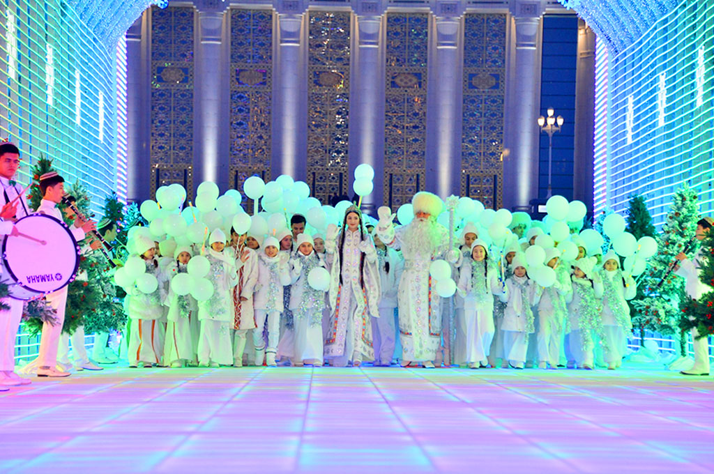 Разноцветными огнями озарилась установленная на столичной площади перед Культурно-развлекательным центром «Älem» Главная ёлка страны, возвестив о скором приходе Нового, 2020 года. В этом году сценаристы подготовили для юных зрителей не только развлекательное, но и с образовательным уклоном представление. Главные герои праздника – Аяз баба, Гарпамык, Билгирдже и Мамметджан – с помощью цифровых технологий побывали во всех уголках страны и ознакомились с достижениями в сфере экономики, культуры и социальной политики. Путешествие новогоднего волшебника с помощниками началось в Балканском велаяте. На современном корабле они проплыли по Каспийскому морю и прибыли в Национальную туристическую зону «Аваза», где почётных гостей встретили юмористы Тикки и Потдыш, а также многочисленные артисты. Прогуливаясь в прибрежном парке «Jadyly kenar», Аяз баба, Гарпамык, Билгирдже и Мамметджан уделяют внимание малышам и взрослым, а дальше решают лететь в Дашогуз. Забронировав билеты онлайн при помощи цифровой системы, они вылетают из Международного аэропорта города Туркменбаши в Дашогуз. Встретив дорогих гостей в воздушной гавани северного региона Туркменистана, их с радостью провожают на центральную площадь, где развернулся туркменский базар. Здесь представлена экспозиция произведений декоративно-прикладного искусства и организована дегустация национальных блюд. Попробовав традиционных угощений, Аяз баба с помощниками спешит поздравить счастливые семьи, переехавшие в новые комфортабельные дома. Они идут в гости к новосёлам с пожеланиями счастливой жизни в новых квартирах. Затем состоялось посещение Лебапского велаята. Вначале гости прибыли в Койтендаг, где осмотрели знаменитые во всём мире следы динозавров, и были приглашены на праздничное торжество в Туркменабате. В центральном парке города разворачиваются яркие выступления молодых артистов, учеников школы искусства, скрипачей. Затем по железной дороге Аяз баба и Гарпамык вместе со спутниками направляются в Мары. Билеты для сказочных героев Билгирдже также бронирует через цифровую систему. Прибыв в Мары, наши гости посещают Марыйскую велаятскую библиотеку, где знакомятся с действующей в библиотеке обсерваторией. Им также рассказывают о библиофонде и электронной системе, внедрённой в библиотеке. Далее Аяз баба, Гарпамык и их спутники направляются на городской рынок – настоящий восточный базар, изобилующий многообразием товаров, где также представлены изящные ювелирные изделия мастеров-зергеров, сельхозпродукция и др. Гости побывали в теплице, где в середине декабря созрел щедрый урожай тропических плодов - бананов. Тепло попрощавшись с Марыйским велаятом, гости отправляются в Ахал. Они посещают стоянку чабанов – «ак ой», где им оказывают душевный приём. За широко расстеленным сачаком они слушают песню бахши и отправляются к месту проведения главного торжества. В центре Ахалского велаята участники сказочного путешествия становятся зрителями музыкальных, хореографических, фольклорных выступлений. Далее дружная компания отправляется в беломраморный Ашхабад, в Культурно-развлекательный центр «Älem», на площади перед которым установлена Главная новогодняя ёлка. Вдоль столичных широких проспектов развернулись выступления творческих групп высших учебных заведений ст