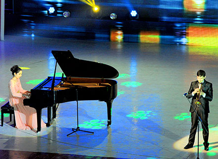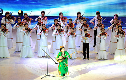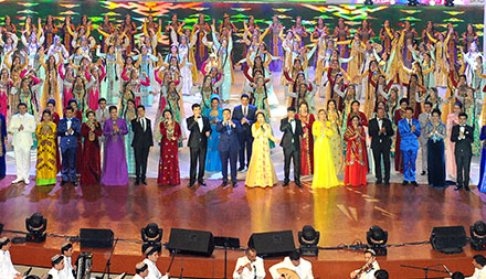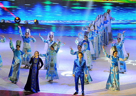 Ашхабад, 17 февраля (TDH). Сегодня в величественном Дворце мукамов Государственного культурного центра Туркменистана состоялся праздничный концерт, посвященный третьей годовщине всенародного избрания на новый срок и вступления в должность Президента Туркменистана Гурбангулы Бердымухамедова. Став символом единства и сплоченности туркменского народа вокруг своего подлинно национального лидера, даты – 12 и 17 февраля 2012 года – вошли историю Отчизны исключительно важной вехой, знаменующей собой стабильный характер демократических процессов в нашей стране, уверенно идущей дорогой мира, созидания и прогресса, и добившейся на этом пути поистине грандиозных успехов. Яркое представление о достижениях нашей страны в эпоху могущества и счастья, славных традициях и богатой культуре туркменского народа, идущего к новым высотам прогресса и процветания под руководством своего лидера – Аркадага, передавали книжная экспозиция и выставка произведений национального изобразительного и декоративно-прикладного искусства, развернувшиеся в просторном фойе Дворца мукамов. Экспозицию украсили замечательные труды главы государства Гурбангулы Бердымухамедова, в том числе многотомная энциклопедия «Лекарственные растения Туркменистана», книга «Туркменистан – край исцелений», уникальные издания, посвященные национальному достоянию – знаменитым на весь мир ахалтекинским скакунам и туркменским коврам. Сегодня имя туркменского лидера – видного общественного и политического деятеля современности, известного своей активной, инициативной позицией и новаторским подходом к решению глобальных проблем человечества, пользуется заслуженно высоким авторитетом в международном сообществе. Мирное небо над головой, царящие в стране спокойствие и стабильность, уверенность народа в незыблемости устоев нашего динамично развивающегося государства, неуклонный рост уровня и качества жизни населения – все это очевидное и бесспорное свидетельство верности и выверенности проводимого Президентом Гурбангулы Бердымухамедовым курса. Встав на путь всеохватных реформ, наша страна под руководством Президента Гурбангулы Бердымухамедова сделала мощный рывок вперед, прочно утвердившись на лидирующих позициях в рейтинговом списке самых динамично развивающихся государств планеты. Этому напрямую способствовала инициированная главой государства и успешно воплощаемая в жизнь масштабная стратегия грандиозных преобразований, подразумевающая, в первую очередь, модернизацию и индустриализацию национальной экономики, в основу которой положен инновационный принцип развития. Наряду с развитием стратегических сфер – топливно-энергетического и агропромышленного комплексов, высокотехнологичных отраслей, выпускающих конкурентоспособную на мировых рынках продукцию, транспортной и информационно-коммуникационной инфраструктуры, значительные инвестиции неизменно направляются в «интеллектуальную сферу» – образование и науку, которые заслуженно признаны двигателями прогресса. Особым приоритетным аспектом государственной политики, имеющей ярко выраженную социальную направленность, выступают здравоохранение, культура и спорт – все то, что служит духовному и физическому совершенствованию нации. До неузнаваемости преобразилась не только наша 