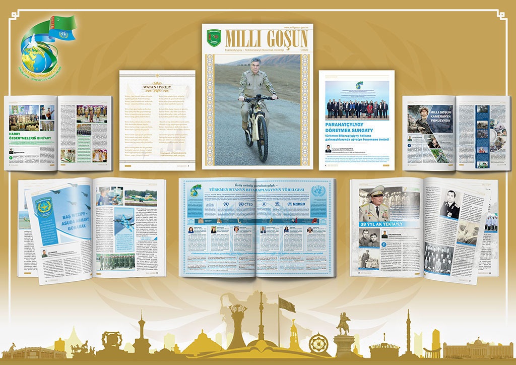 Вышел в свет первый в нынешнем году номер ежеквартального журнала «Национальная армия» («Milli goşun»), издаваемого Министерством обороны. Общественно-политическое, военно-историческое и научно-методическое издание нацелено на патриотическое воспитание молодёжи, а также освещение хода военной реформы, инициированной Президентом, Верховным Главнокомандующим Вооружёнными Силами Туркменистана генералом армии Гурбангулы Бердымухамедовым. Очередной выпуск журнала открывает статья, посвящённая 25-й годовщине обретения Туркменистаном нейтрального статуса, ставшего феноменом в международных отношениях. Приводимые в материале примеры наглядно демонстрируют успехи страны на мировой арене. Одна из статей номера посвящена празднованию 27 января Дня защитников Отечества и знакомит читателей с преобразованиями в военной сфере. Как подчёркивается в материале, на основе Военной доктрины, носящей сугубо оборонительный характер, наша страна проводит комплексную работу по материально-техническому переоснащению Вооружённых Сил и совершенствованию подготовки солдат. При этом, особо подчёркивает автор материала, большое внимание уделяется реализации творческого и интеллектуального потенциала молодых военнослужащих. В настоящее время юноши проходят срочную службу с учётом их способностей и гражданских специальностей. Например, наряду с боевой подготовкой, призывники с музыкальным образованием могут входить в состав военных оркестров и ансамблей, а молодые учёные – проводить исследования в научных подразделениях воинских частей. Вниманию читателей представлена статья, знакомящая с процессом подготовки короткометражных военно-патриотических видеороликов, отражающих успехи военной реформы, нацеленной на укрепление потенциала Национальной армии независимого, постоянно нейтрального Туркменистана. Материал содержит кадры из видеосюжетов, которые в настоящее время демонстрируются на отечественном телевидении и популярных веб-сайтах. О том, какой позитивный отклик они вызывают у молодёжи, свидетельствуют отзывы о данных видеоработах в сети интернет. В другой статье рассказывается о службе пилотов Военно-воздушных сил и войска противовоздушной обороны. Автор описывает захватывающие чувства, которые испытывает человек во время полёта на сверхзвуковом самолёте, знакомит с особенностями подготовки лётчиков истребительной авиации. Читатели узнают, какими личностными качествами должен обладать офицер ВВС, как проводится ежедневная тренировка, осуществляется подготовка к военным учениям, парадам и др. Выпуск продолжает статья, посвящённая 75-й годовщине Победы в Великой Отечественной войне 1941-1945 годов. Автор приводит важные факты о вкладе туркменского народа в Великую Победу. Так, 104 туркменских воина были удостоены почётного звания Герой Советского Союза, более 130 тысяч – различных боевых орденов и медалей. Туркменские женщины пожертвовали в Фонд обороны 7 тысяч 392 килограмма драгоценностей, что составило 75 процентов от общих сборов со всех республик Союза. На развороте издания представлена инфографика, отражающая динамику успешного сотрудничества Туркменистана с авторитетными международными организациями, в том числе с Организацией Объединённых Наций, Организацией по безопасности и сотрудничеству в Европе, Ме