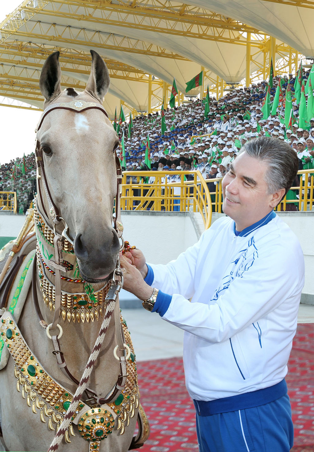 Сегодня в Президентском ахалтекинском конном комплексе при участии главы государства Гурбангулы Бердымухамедова состоялись торжества в честь Национального праздника туркменского скакуна, в рамках которых прошли церемония награждения победителей и призеров международного конкурса красоты ахалтекинских коней и тематического состязания среди представителей творческих профессий. Международный конкурс красоты ахалтекинских скакунов, ежегодно проводимый в стране, является одним из главных праздничных мероприятий во славу туркменских коней. Он направлен на стимулирование развития традиций коневодства, привлечение внимания мировой общественности к этой породе как яркой составляющей богатейшего культурного наследия нации, уникальному цивилизационному явлению, а соревновательный дух только усиливает зрелищность и эмоциональный накал событий. Заместители Председателя Кабинета Министров, руководители Меджлиса, министерств и ведомств страны, хякимы велаятов и города Ашхабада, члены Международной ассоциации ахалтекинского коневодства и представители СМИ прибыли сегодня утром в Ахалтекинский конный комплекс Президента Туркменистана. Здесь также собрались чествуемые в эти дни знатные коневоды, добившиеся замечательных успехов в избранном на всю жизнь деле, настоящие профессионалы других сфер, так или иначе связанных с удивительным миром коней. В этом коневодческом центре созданы великолепные условия для выращивания и воспитания элитных скакунов, что выдвигает его на одно из ведущих мест в мировой конной индустрии, привлекая большое внимание экспертов и специалистов отрасли со всего света. Ведь ахалтекинские кони, будучи национальным достоянием и гордостью туркменского народа, олицетворяют собой эталон красоты и гармонии, рождённый в союзе с природой созидательным человеческим гением. Именно поэтому сегодня благородный скакун является символом современной эпохи Туркменистана – образом преемственности исторического опыта, триумфа высоких идеалов, одухотворённого труда и энергичной нацеленности на развитие. Автомобиль Президента Гурбангулы Бердымухамедова подъезжает к Ахалтекинскому конному комплексу. Глава государства проследовал к президентской ложе на зрительской трибуне. От имени всех коневодов страны как символ признательности за деятельное внимание к их работе, а также в честь знаменательного события главу государства просят принять в дар избранных ахалтекинских коней. На площадку одного за другим выводят скакунов от каждого велаята страны и от столицы. Вместе с ними по очереди выходят руководители всех регионов, старейшины и представители молодого поколения. Так, от имени тружеников Ахалского велаята был передан в дар прекрасный конь Новруз, от Балканского велаята - Хазар, Дашогузского велаята – Герчек, Лебапского велаята – Койтен, Марыйского велаята - Ковум, а от города Ашхабада – Пайтагт. От имени военных и правоохранительных органов Президенту Гурбангулы Бердымухамедову подарили скакуна по имени Эдермен. Еще один подарок - от имени всех коневодов страны. На демонстрационную площадку выводят великолепного скакуна Тойлы, представляют его и вручают паспорт. Президент Туркменистана выразил признательность принимающим участие в празднестве старейшинам велаятов, всем коневодам, 