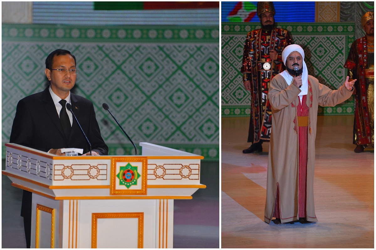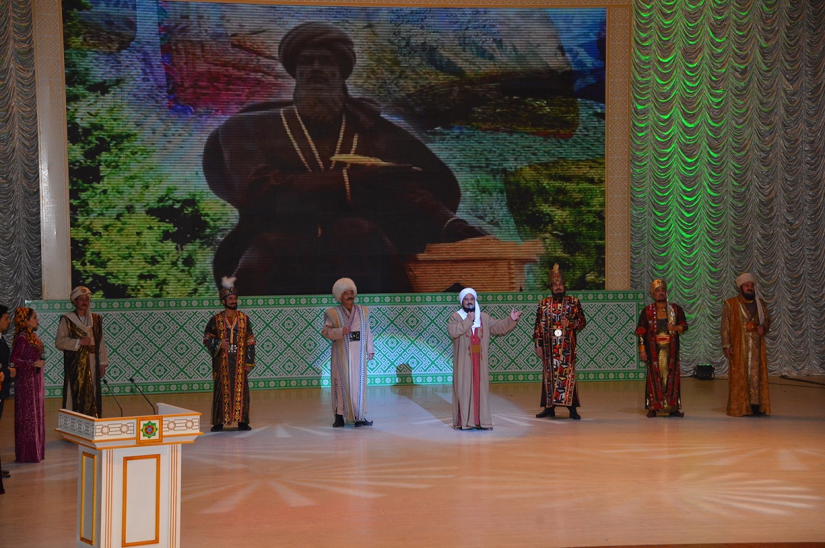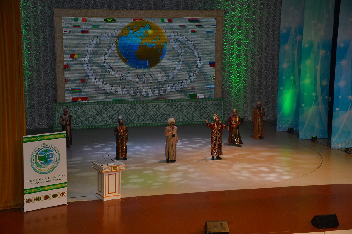 11 января во Дворце мукамов Государственного культурного центра состоялось мероприятие, посвящённое девизу 2021 года «Туркменистан – Родина мира и доверия». Туркменское государство вошло в новый год эпохи могущества и счастья, ознаменованный 30-летием независимости Отчизны, – под знаком юбилейной даты прошло и нынешнее мероприятие. Литературно-музыкальная композиция «Parahatçylygy we ynanyşmagy dünýä ýaýan Gahryman Arkadag!», вдохновенно исполненная артистами Главного драматического театра имени Великого Сапармурата Туркменбаши и Государственного русского драматического театра имени А.С.Пушкина, стала творческим выражением признательности Президенту Гурбангулы Бердымухамедову. Композиция, тепло встреченная зрителями, отразила всю глубину любви и уважения туркменского народа к лидеру нации, благодаря которому независимый нейтральный Туркменистан стал экономически мощным государством, обрёл прочный международный авторитет. Торжество во Дворце мукамов прошло с участием членов Правительства, руководителей Министерства культуры, профильных ведомств и учреждений, СМИ, ректоров вузов, деятелей творческого цеха и мастеров искусств. Как отмечали выступавшие, в девизе 2021 года символически объединены важные константы современного развития нашего государства – стремление к прогрессу и всеобщему миру, приверженность национальным историко-культурным ценностям. Слоган 2021 года отражает концепцию Президента Гурбангулы Бердымухамедова по социально-экономическому прогрессу страны в контексте Целей устойчивого развития и миротворческой позиции постоянно нейтрального Туркменистана, выступающего надёжным партнёром в решении ключевых задач международного сотрудничества. Отмечалось, что тема нынешнего года сопряжена с глобальными инициативами, выдвигаемыми туркменским лидером, о чём красноречиво свидетельствует тот факт, что Генассамблея ООН единогласно и при соавторстве 73 государств-членов приняла инициированную нашей страной Резолюцию об объявлении 2021 года Международным годом мира и доверия. Выступавшие подчёркивали, что девиз 2021 года соответствует менталитету туркмен, их историческим и культурным традициям, он неразрывно связан с гуманистическими принципами, ныне выступающими основой внутренней и внешней политики Президента Гурбангулы Бердымухамедова, поступательного развития нашего государства – созидателя и миротворца. Уважаемые в стране творческие люди, которых с почтением называют халипа, в своих обращениях к участникам торжественной акции отмечали, что провозглашение по волеизъявлению народа девиза нынешнего года способствует повышению патриотического духа и стремления туркменистанцев быть причастными и вносить свой вклад в колоссальную работу, проводимую в стране под руководством лидера нации. В содержание главного слогана страны заложена также мысль о преемственности поколений и воспитании молодёжи в духе безграничной гордости, любви и уважения к Отчизне – независимому, постоянно нейтральному Туркменистану, отмечали выступавшие. Участники мероприятия высказали уверенность, что год 30-летия священной независимости будет ознаменован новыми масштабными достижениями во всех сферах жизни государства и общества. Выступления артистов столичных театров, народных и эстрадных исполнителей перекликались с 