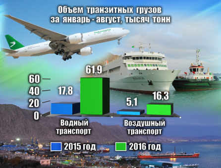 Важнейшей задачей для национальной экономики Президент Гурбангулы Бердымухамедов поставил вывод отечественной продукции на внешние рынки и расширение торгово-экономических связей нашей страны с зарубежными партнерами. Это во многом зависит от степени вовлеченности Туркменистана в глобальную и региональную транспортно-коммуникационную системы, являющиеся материальной базой и инструментом товарообмена между государствами. В данной связи в нашей стране ведется активное расширение логистической сети, реализуются проекты по транспортному обеспечению торговых взаимосвязей и прокладке маршрутов, которые смогут принять на себя растущие объемы транзитных грузопотоков в направлении Европа – Азия и обратно. По данным Государственного комитета по статистике, за январь-август 2016 года через территорию нашей страны было транспортировано свыше 1,7 миллиона тонн транзитных грузов. Преобладающая часть их перевозилась железнодорожным (61,5 процента) и автомобильным (34 процента) транспортом. За этот же период через территорию Туркменистана проследовало 31,3 тысячи единиц грузовых автомобилей, что на 6,2 процента больше, чем за соответствующий период 2015 года. Наибольшую их долю занимали автомобили Турции – 52,3 процента и Ирана – 37,2 процента. Объём услуг, оказанных за перевозки транзитных, экспортных и импортных грузов железнодорожным транспортом, в январе–августе 2016 года составил 122,9 миллиона долларов США, в том числе за транзитные перевозки – 74,5 миллиона долларов США, за экспортные – 42,3 миллиона долларов США, импортные – 6,1 миллиона долларов США. Общий объем данных услуг по сравнению с январем–августом 2015 года вырос на 8,8 процента. Это произошло, в основном, за счет увеличения на 7,2 процента объемов услуг за перевозку транзитных грузов, которые в общем объеме услуг по перевозке грузов занимают 60,6 процента, а также за счет роста объема экспортных грузов на 43,8 процента. В то же время на 56,4 процента сократился объем услуг по перевозке импортных грузов, что является следствием успешно реализуемой государственной программы по замещению зарубежной продукции отечественными товарами. Главной целью государственной транспортной политики лидером нации Гурбангулы Бердымухамедовым определено формирование высокоэффективной национальной транспортной системы, призванной обеспечить удовлетворение спроса на перевозки грузов и пассажиров, повышение их безопасности и качества, создание условий для инвестиционной активности, роста конкурентоспособности отечественных перевозчиков на внутреннем и внешнем рынке транспортных работ и услуг. За январь–август 2016 года всеми видами транспорта (кроме трубопроводного) перевезено более 6 миллионов тонн экспортных грузов, что на 6,7 процентов больше, чем за аналогичный период 2015 года. Экспортные перевозки осуществлялись водным транспортом (52,1 процента), автомобильным (29,6 процента), а также железнодорожным (18,2 процента) и воздушным транспортом (0,1 процента). Импортных грузов за январь–август 2016 года перевезено в объеме более 3,1 миллиона тонн, что на 25,3 процента меньше, чем за соответствующий период 2015 года. В их перевозках основная доля приходилась на автомобильный транспорт (51,7 процента). Железнодорожный транспорт занимал 34 процента, водный – 14,1 процента и воздушный транспорт – 0,2 процента. По с