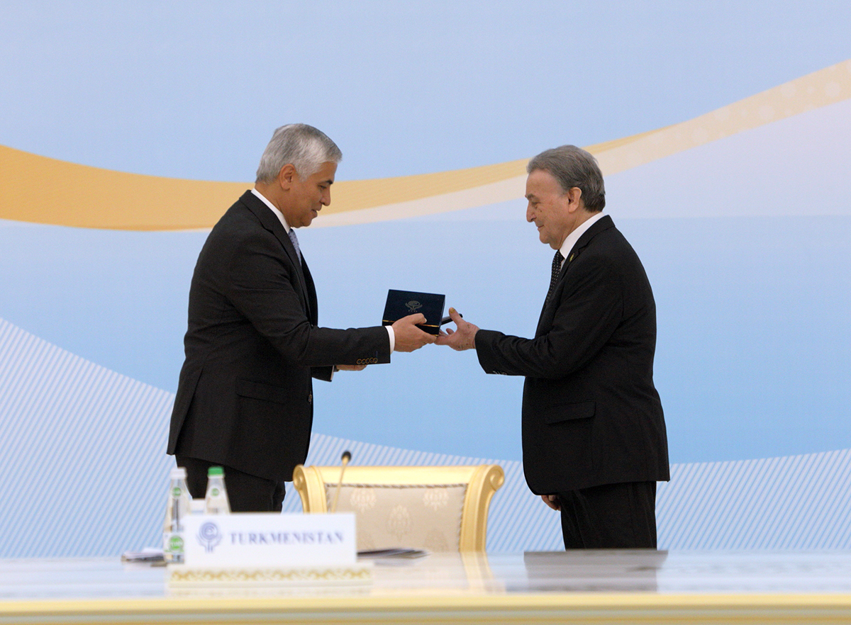 Почётная награда этой Организации в торжественной обстановке была вручена представителю Туркменистана Генеральным секретарем ОЭС Хусравом Нозири.
