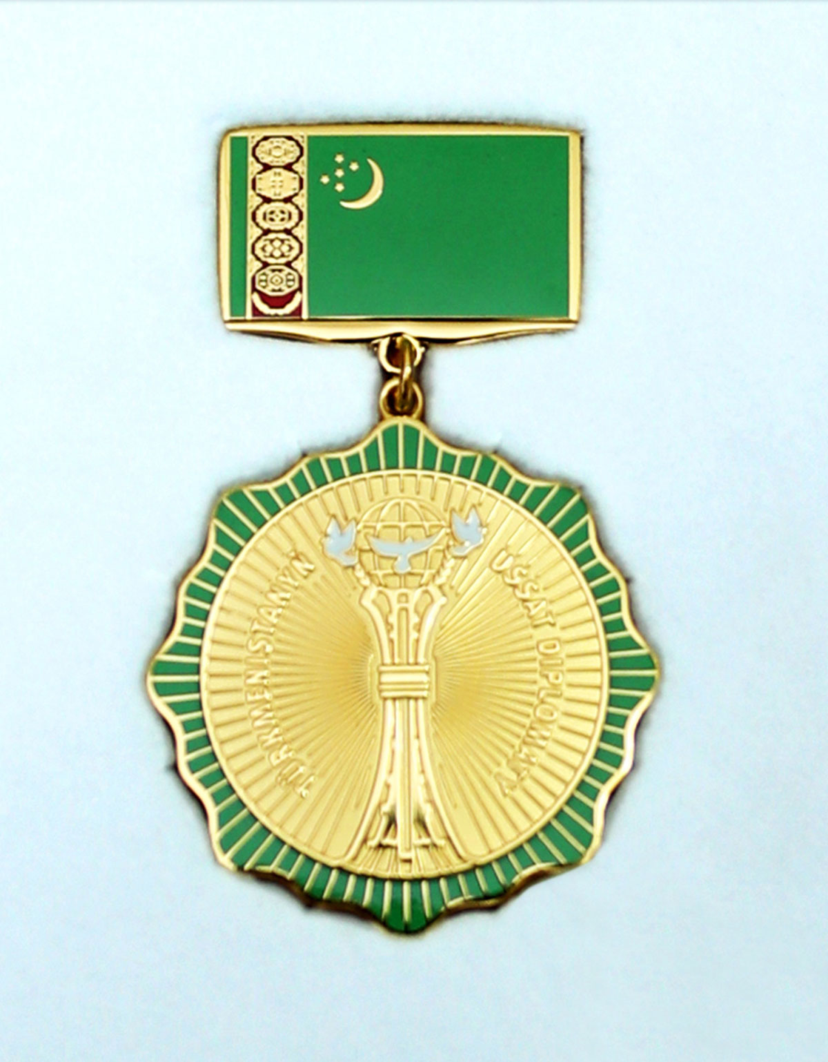 Как известно, этот отличительный знак был учреждён Постановлением лидера нации, подписанным 9 февраля 2021 года, в целях награждения сотрудников отечественной дипслужбы за личный вклад в реализацию миролюбивой конструктивной внешней политики нейтрального Туркменистана, укрепление отношений с зарубежными государствами в политической, торгово-экономической, научно-образовательной, культурно-гуманитарной и иных областях, расширение эффективного диалога с авторитетными международными организациями и за другие заслуги перед Родиной.