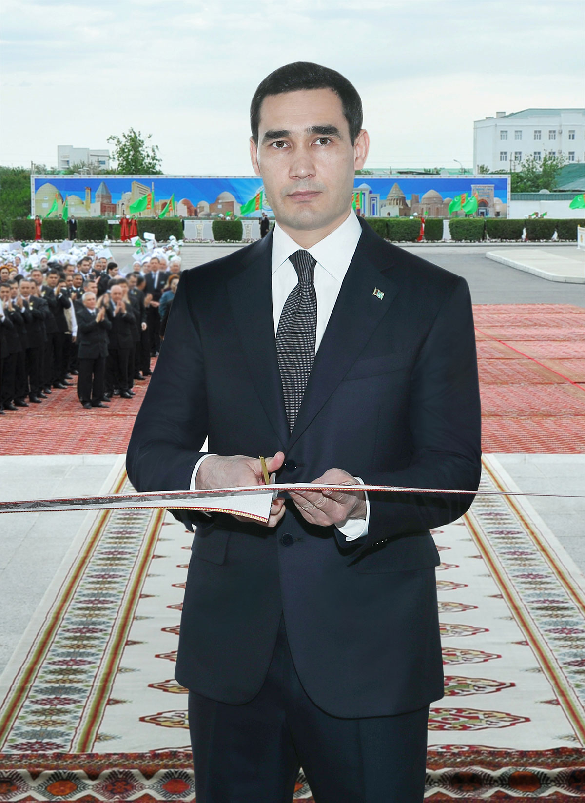 Поприветствовав собравшихся, Президент Сердар Бердымухамедов в торжественной обстановке под бурные аплодисменты участников церемонии перерезает символическую ленту и проходит внутрь здания.
