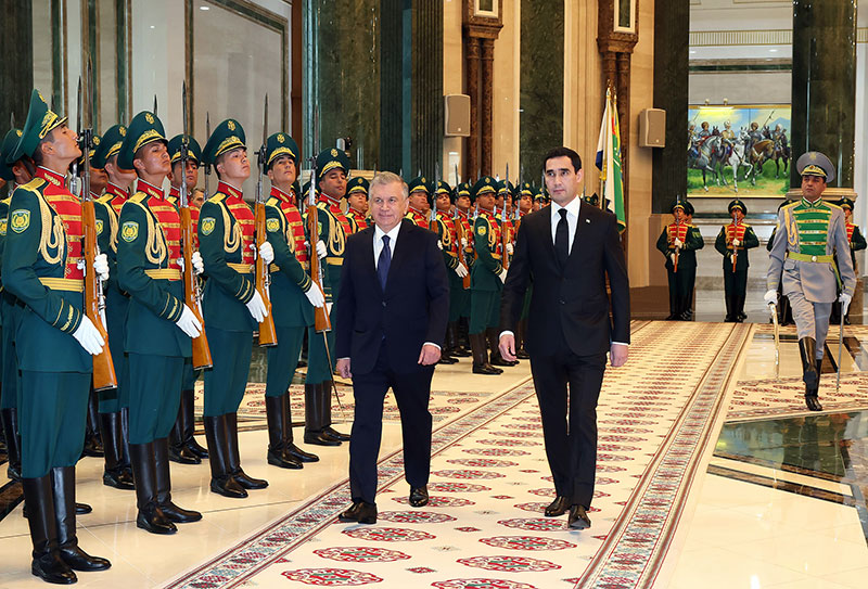 Торжественно рапортует командующий ротой Почётного караула. Исполняются Государственные гимны двух соседних стран. Президенты Сердар Бердымухамедов и Шавкат Мирзиёев обходят строй воинов Почётного караула и отдают дань уважения Государственному флагу Туркменистана.