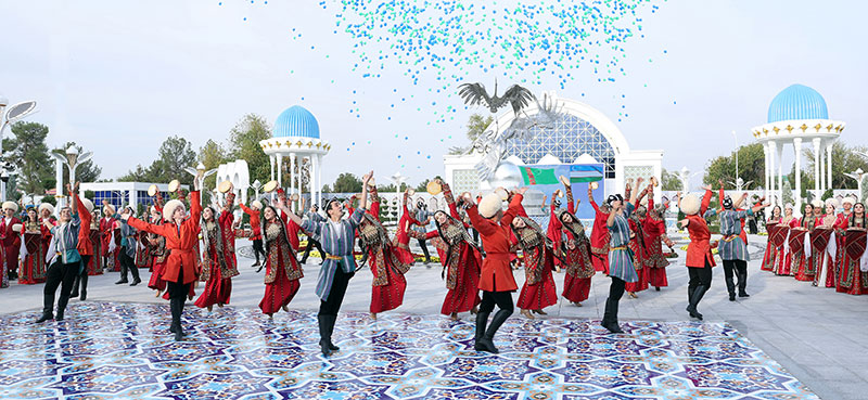 Президентов Сердара Бердымухамедова и Шавката Мирзиёева радостно приветствуют дети в традиционных узбекских и туркменских костюмах, которые с вдохновением декламируют стихи. Празднично звучат национальные узбекские духовые музыкальные инструменты – карнаи, задают ритм звонкие барабаны. Своё искромётное мастерство демонстрируют юные артисты.