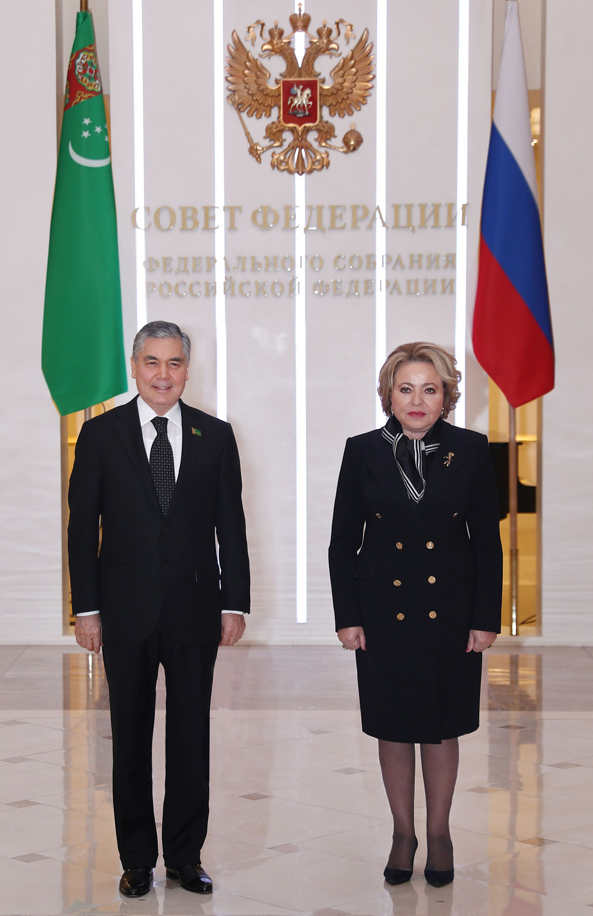Во второй половине дня Председатель Халк Маслахаты Милли Генгеша Туркменистана проследовал в Совет Федерации Федерального Собрания Российской Федерации. Здесь, в фойе, Аркадага Гурбангулы Бердымухамедова сердечно приветствовала Спикер верхней палаты Парламента России Валентина Матвиенко. Председатель Халк Маслахаты Милли Генгеша Туркменистана преподнёс своей российской коллеге букет цветов.
