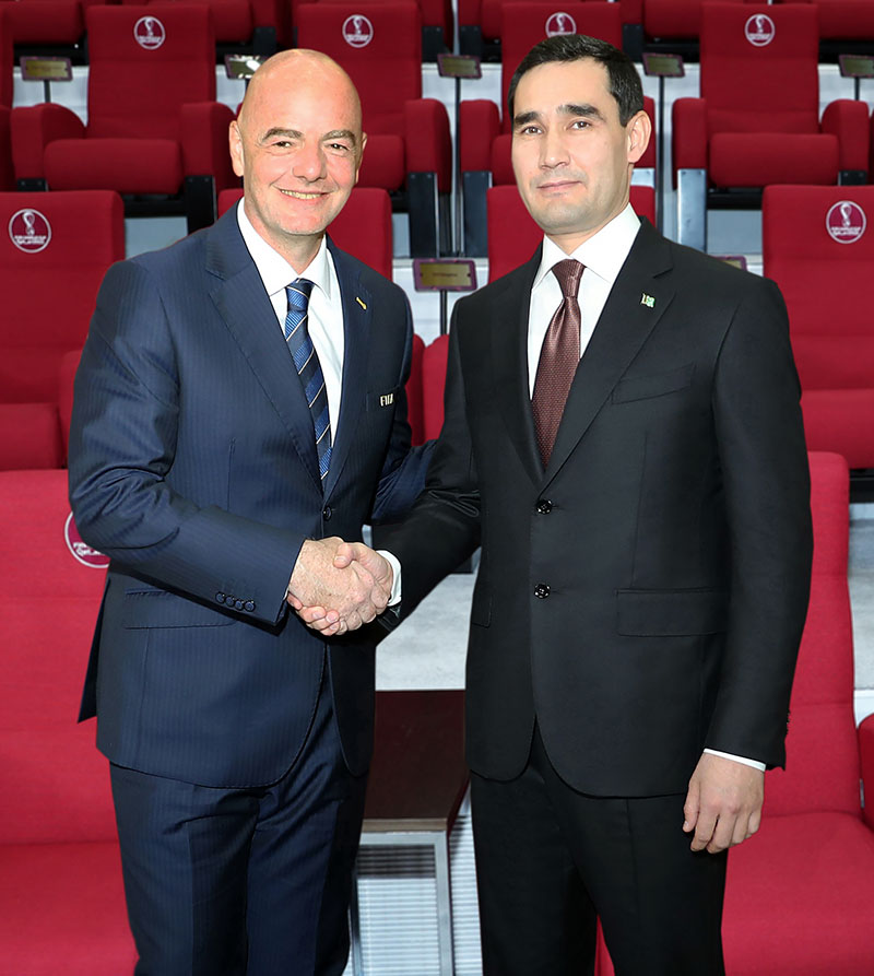 Также здесь тепло поприветствовали друг друга Президент Сердар Бердымухамедов и глава Международной федерации футбольных ассоциаций (FIFA) Джанни Инфантино. Глава FIFA подчеркнул важность нынешнего визита Президента Туркменистана в Катар для развития международных отношений в области спорта, особенно футбола. Отмечалось, что в Туркменистане широко развиваются спорт и олимпийское движение, а также подчёркивалось большое значение содействия fifa в объединении усилий на международном уровне для широкого распространения такого вида спорта, как футбол.