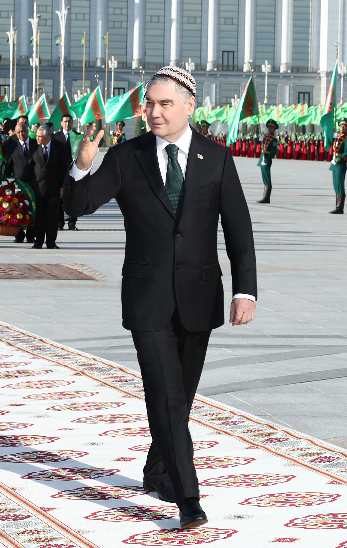 В торжественной обстановке Аркадаг Гурбангулы Бердымухамедов возлагает к подножию гигантского флагштока великолепный венок.