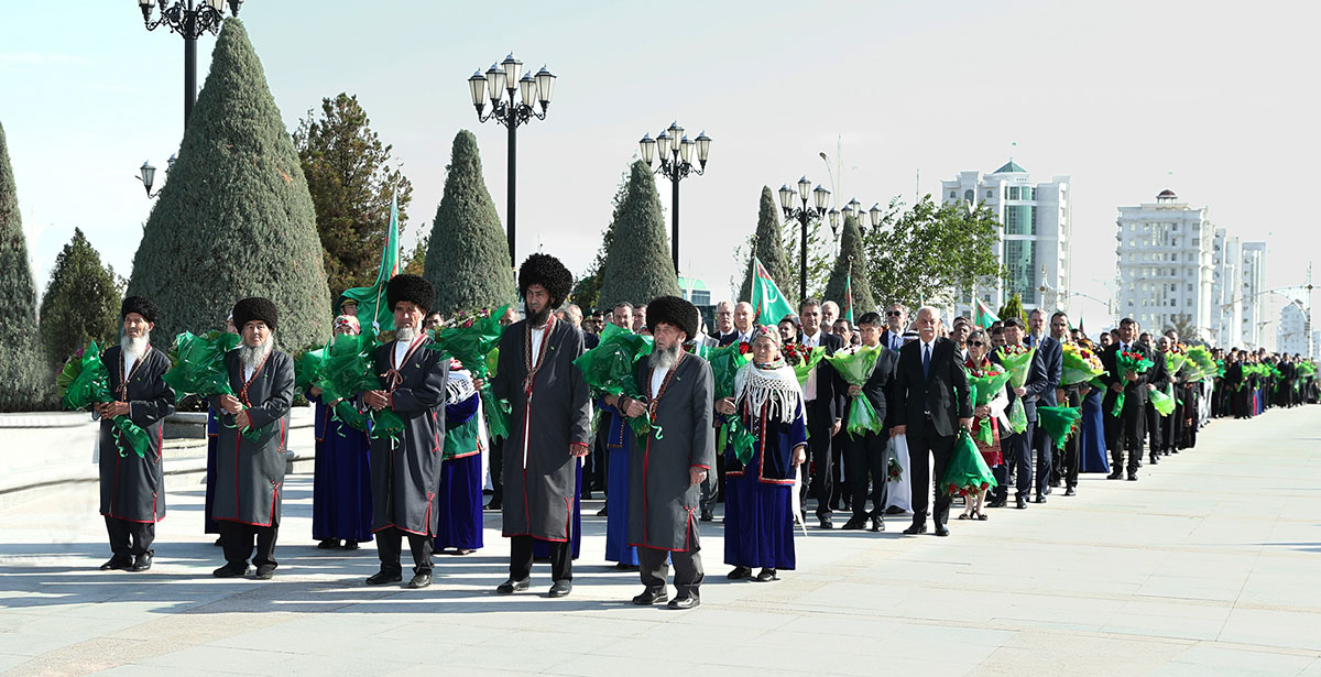 …С раннего утра у величественного Монумента Конституции, возвышающегося на живописном фоне гор древнего Копетдага, собрались члены Правительства, руководители Меджлиса, военных и правоохранительных органов, международных организаций и дипмиссий, аккредитованных в Туркменистане, министерств и ведомств, почётные старейшины, представители общественных организаций, СМИ, студенческая молодёжь, деятели культуры, многочисленные жители столицы.