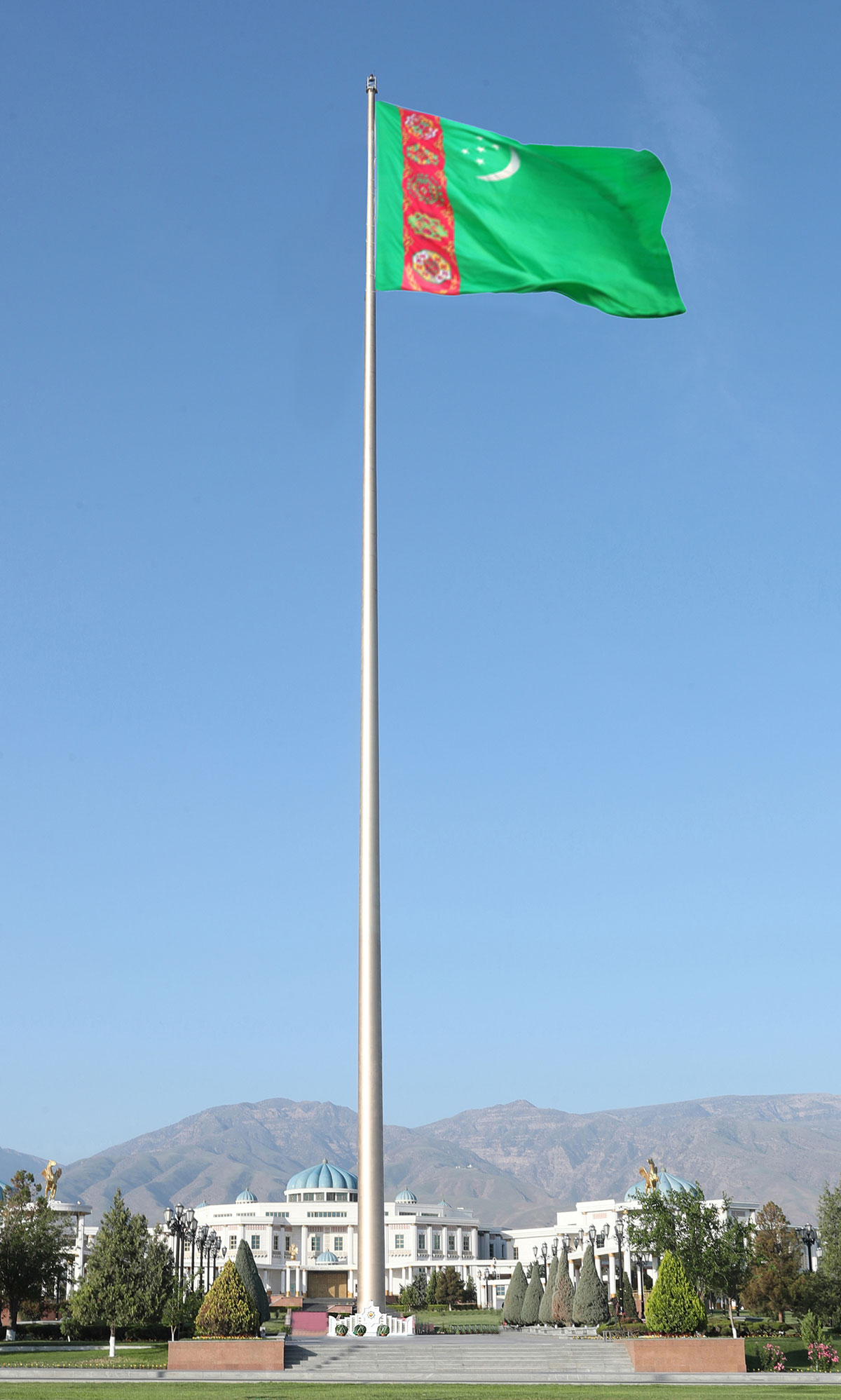 Установленный в одном из красивейших уголков Ашхабада, Государственный Стяг виден практически из любой части города. Развернувшись во всём своём величии, он гордо реет в вышине, олицетворяя священную независимость Отчизны, неразрывную связь времён и поколений, богатейшую историю и культуру, мудрую жизненную философию туркмен, их славное прошлое, прекрасное настоящее и устремлённость в светлое будущее.