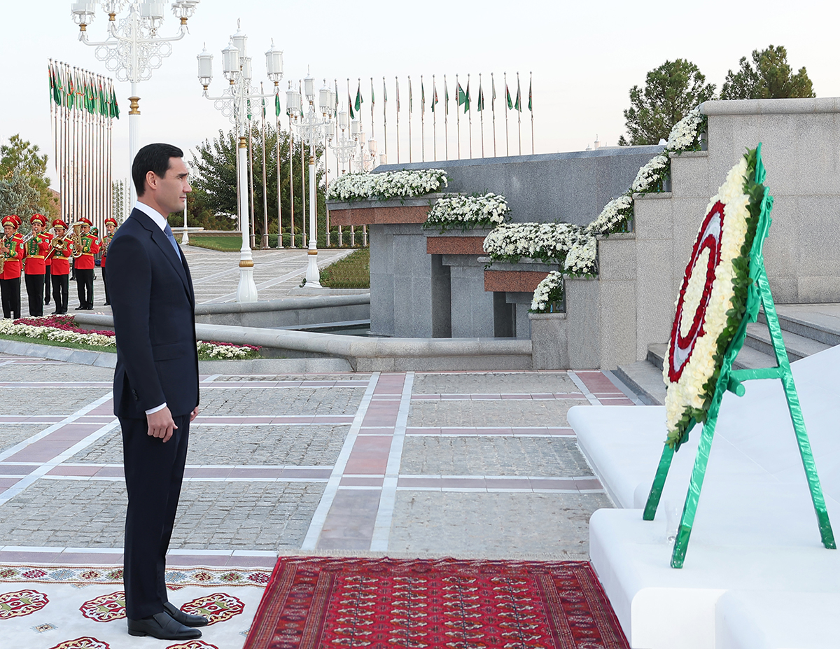 Звучит Государственный гимн Туркменистана. В торжественной обстановке Президент страны возлагает венок к памятной плите, установленной перед входом в мемориальный комплекс, – рукотворный символ грандиозных свершений новейшей истории туркменского народа. Высоко в небесную синь устремлён сияющий в лучах рассветного солнца золочёный шпиль Монумента независимости, воплощая собой устремлённость Отчизны в светлое будущее.