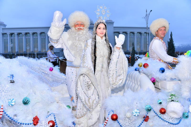 Огнями световых гирлянд озарилась Главная ёлка страны, возвестив о скором приходе Нового года. Церемония зажжения огней на самой нарядной зелёной красавице высотой около 39 метров традиционно состоялась на площади перед столичным Культурно-развлекательным центром «Älem». В торжестве приняли участие всеми любимые персонажи – Аяз баба и Гарпамык, популярные эстрадные исполнители и театральные коллективы, юные артисты. В их числе – детские танцевальные ансамбли «Шaтлык», «Aкпамык», «Рухубелент чагалар», «Гызылгызджагаз», «Джошгун» и др., артисты Национального драматического театра имени Алп Арслана и Государственного театра кукол, веселые клоуны и жонглеры Туркменского государственного цирка, ловкие акробаты цирковой труппы Туркменского государственного института культуры. Аяз баба и Гарпамык поздравили участников праздника, собравшего тысячи юных ашхабадцев и гостей столицы, с наступающим Новым – 2017 годом. Кульминационным моментом шоу стала засверкавшая по желанию ребят и мановению волшебной палочки Аяз баба красавица-ёлка. Чудесными огоньками в этот момент зажглись и все новогодние ёлки, установленные на главных площадях городов и сёл страны, где сегодня также проходят красочные представления, звучат стихи и песни. Завершилось торжество большим концертом с участием детского хора, популярных эстрадных певцов, исполнивших весёлые песни, посвящённые встрече Нового года. До начала торжественной церемонии кортеж Аяз баба и Гарпамык проследовал по нарядным улицам столицы. По сценарию, путь к Главной ёлке страны Аязбаба начал с заснеженных вершин Койтендага и посетил места, ознаменованные яркими событиями завершающегося года. Особую радость этот праздник приносит детворе. Утренниками и карнавалами, музыкальными и театрализованными представлениями новогодние мероприятия придут в детские сады и школы, театры и культурные центры.