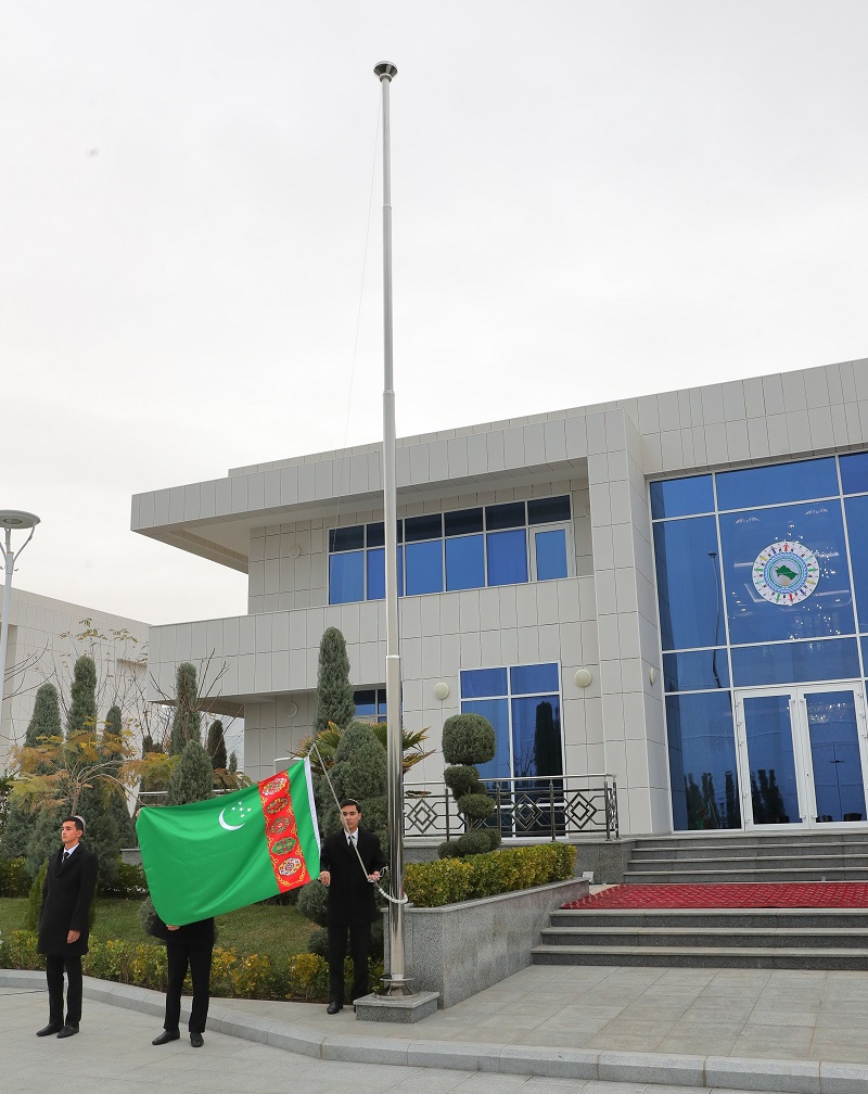 Под звуки Государственного гимна Туркменистана высоко поднимается Государственный флаг страны.