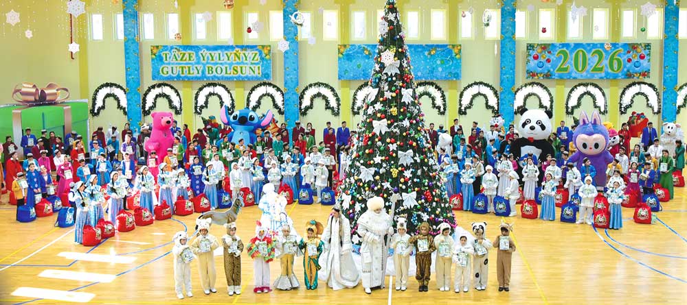 Сегодня в детском городке возле большой ёлки царит праздничная атмосфера. Воспитанников Дворца «Döwletliler köşgi» пришли поздравить с Новым годом Аяз баба, Гарпамык, символ наступившего 2026 года Лошадь, а также руководители и представители ряда министерств, ведомств и общественных организаций.