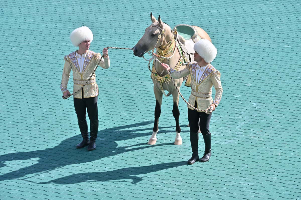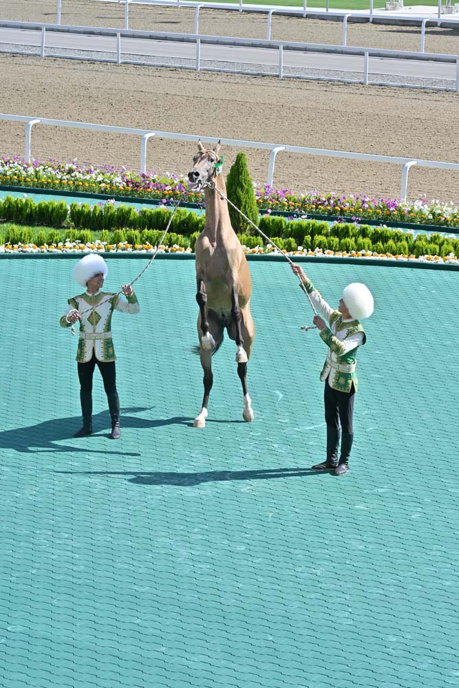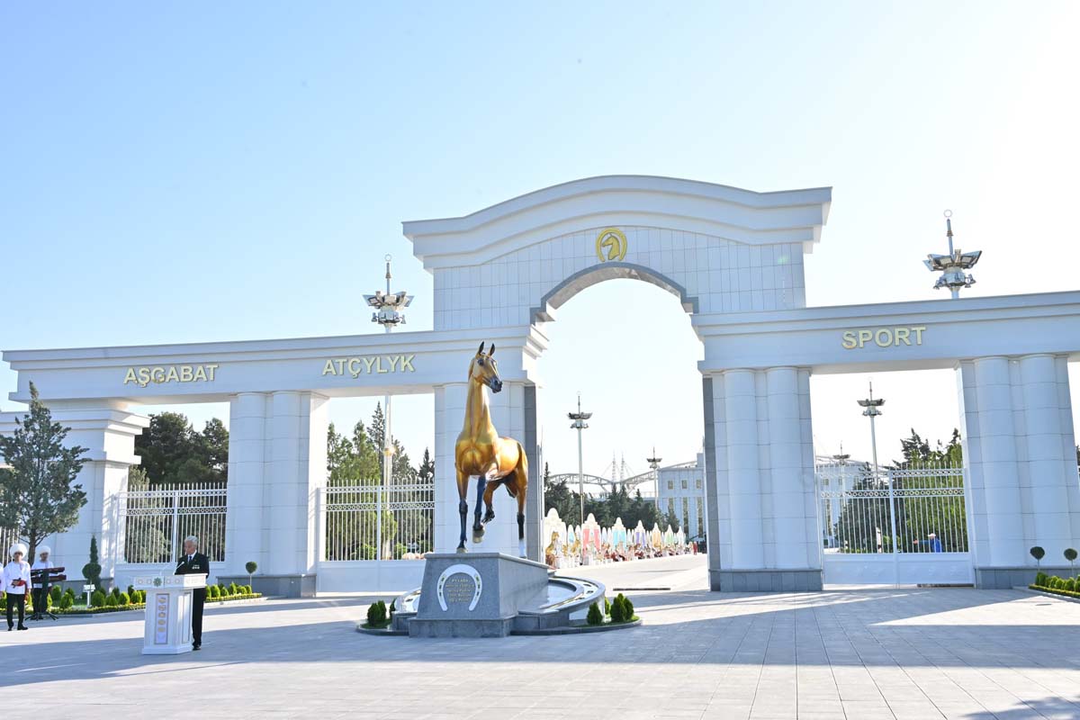 Президент страны осмотрел установленный перед главным входом в комплекс памятник знаменитому ахалтекинскому скакуну Пыяда. Здесь также развернулись выступления мастеров культуры и искусства. В композициях воспевались великолепные ахалтекинские скакуны, ставшие гордостью нашего народа.